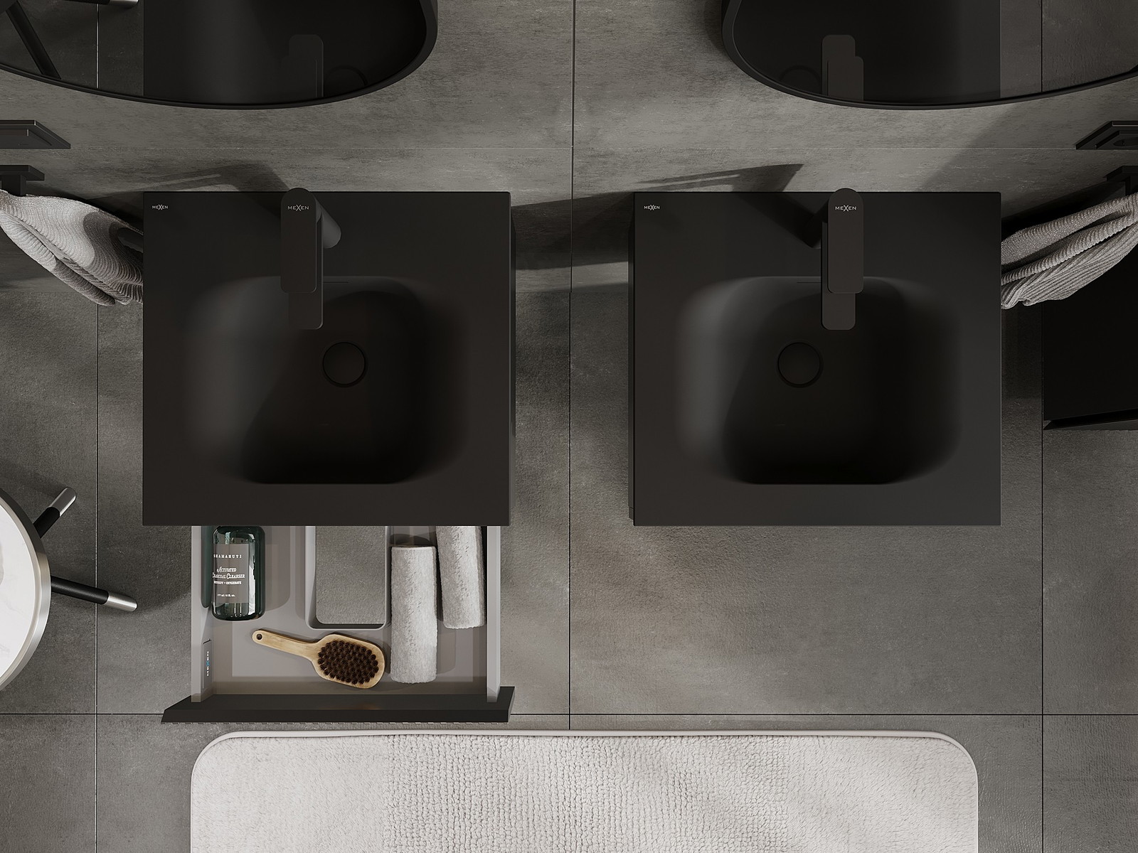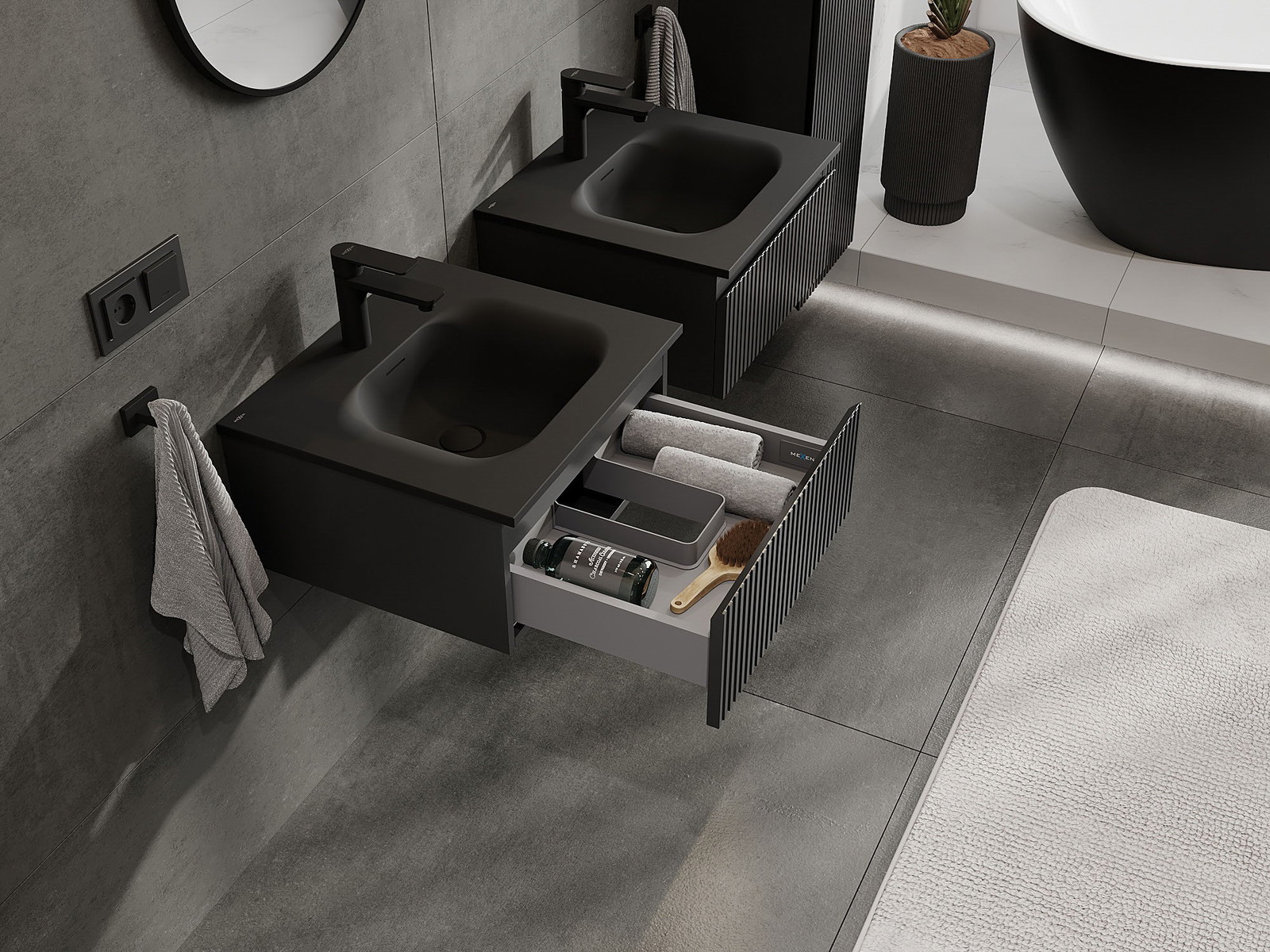 A fiókban lévő kivágás úgy van kialakítva, hogy befogadja a mosdó telepítéseknél szükséges szifont. Ennek köszönhetően a bútor teljesen funkcionálisan felszerelhető anélkül, hogy a fiók terének egy részét fel kellene áldozni a telepítés miatt.