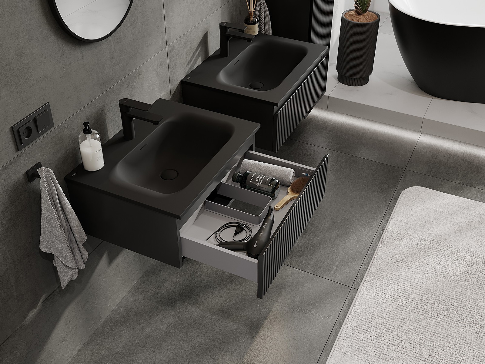 A fiókban lévő kivágás úgy van kialakítva, hogy befogadja a mosdó telepítéseknél szükséges szifont. Ennek köszönhetően a bútor teljesen funkcionálisan felszerelhető anélkül, hogy a fiók terének egy részét fel kellene áldozni a telepítés miatt.