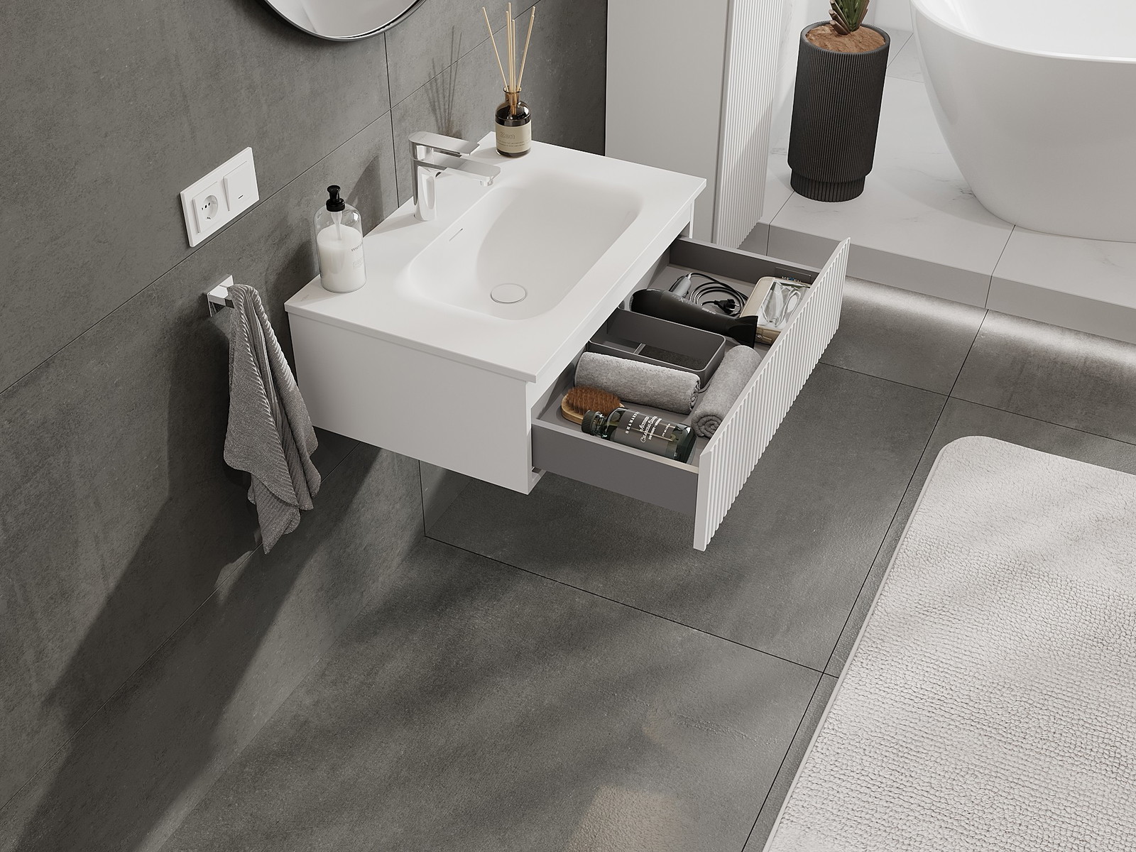 A fiókban lévő kivágás úgy van kialakítva, hogy befogadja a mosdó telepítéseknél szükséges szifont. Ennek köszönhetően a bútor teljesen funkcionálisan felszerelhető anélkül, hogy a fiók terének egy részét fel kellene áldozni a telepítés miatt.