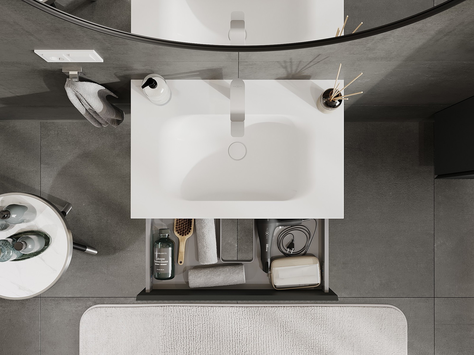 A fiókban lévő kivágás úgy van kialakítva, hogy befogadja a mosdó telepítéseknél szükséges szifont. Ennek köszönhetően a bútor teljesen funkcionálisan felszerelhető anélkül, hogy a fiók terének egy részét fel kellene áldozni a telepítés miatt.