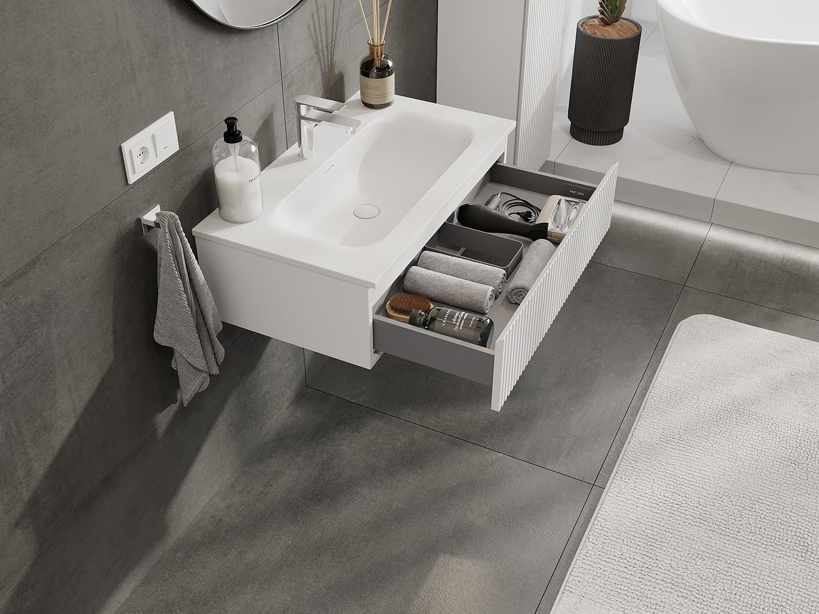 A fiókban lévő kivágás úgy van kialakítva, hogy befogadja a mosdó telepítéseknél szükséges szifont. Ennek köszönhetően a bútor teljesen funkcionálisan felszerelhető anélkül, hogy a fiók terének egy részét fel kellene áldozni a telepítés miatt.