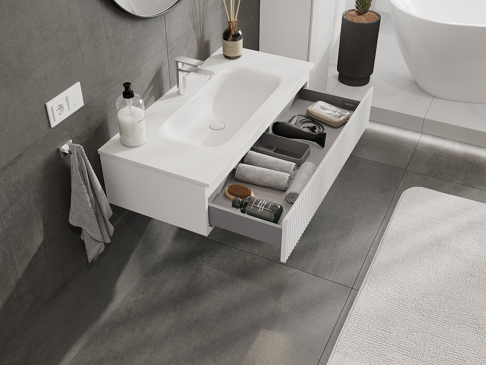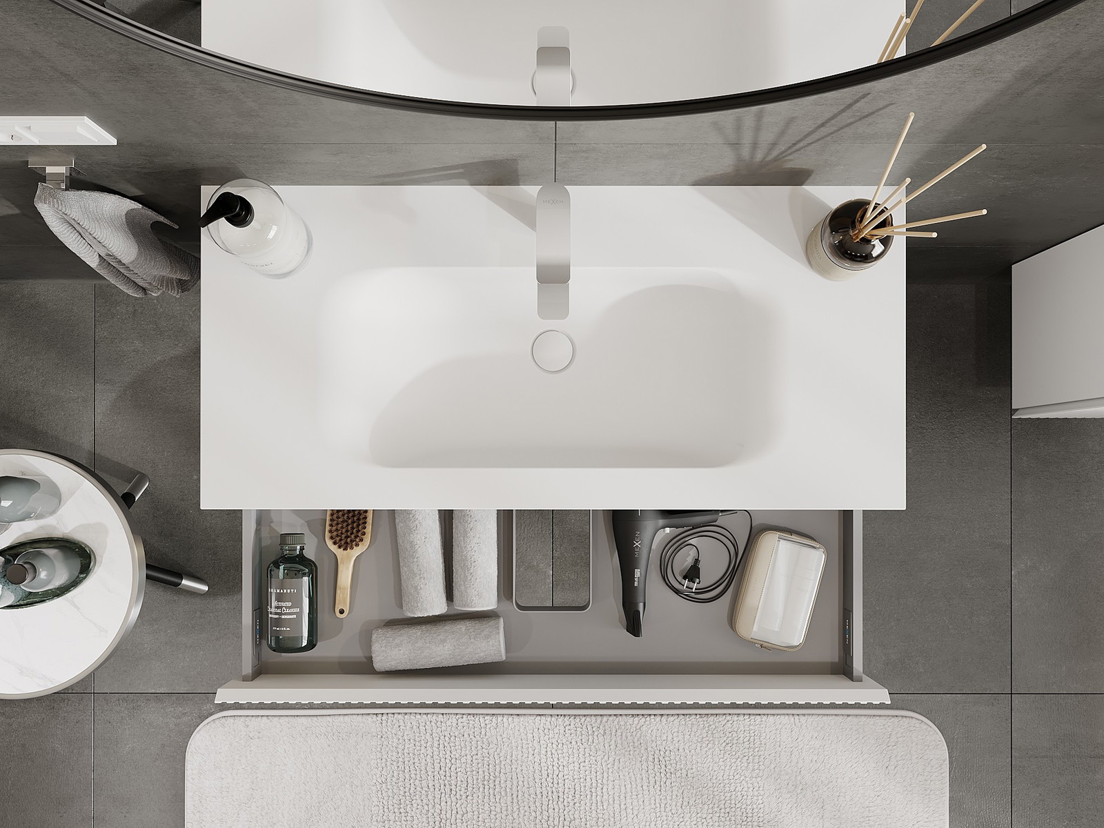 A fiókban lévő kivágás úgy van kialakítva, hogy befogadja a mosdó telepítéseknél szükséges szifont. Ennek köszönhetően a bútor teljesen funkcionálisan felszerelhető anélkül, hogy a fiók terének egy részét fel kellene áldozni a telepítés miatt.