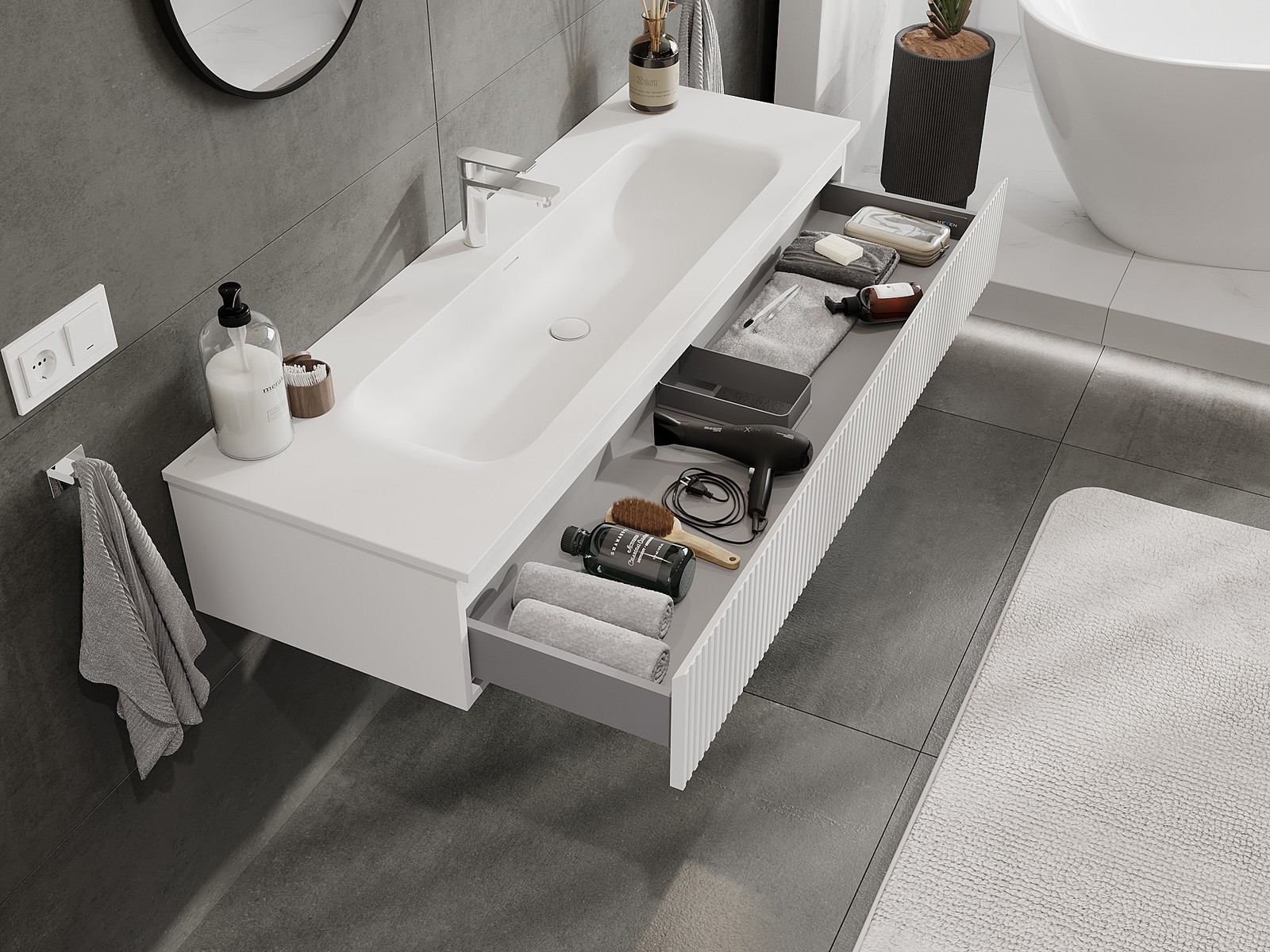 A fiókban lévő kivágás úgy van kialakítva, hogy befogadja a mosdó telepítéseknél szükséges szifont. Ennek köszönhetően a bútor teljesen funkcionálisan felszerelhető anélkül, hogy a fiók terének egy részét fel kellene áldozni a telepítés miatt.