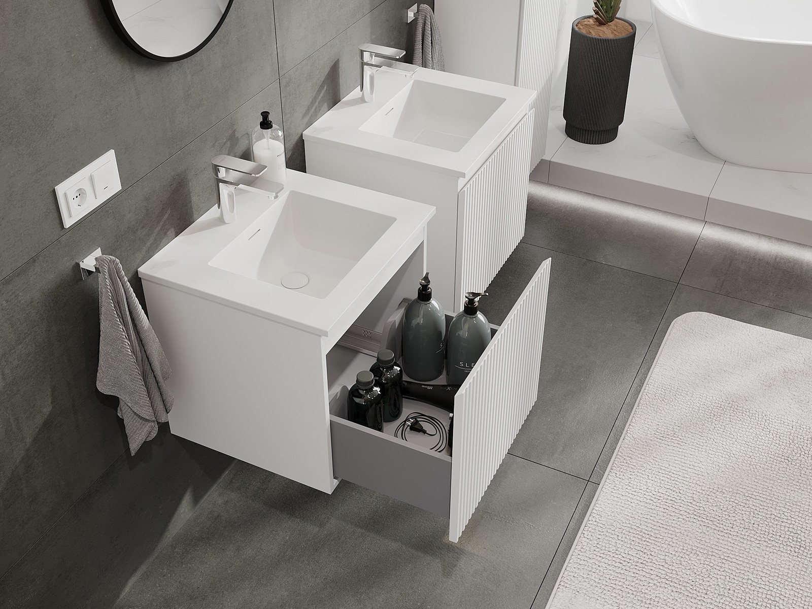 A moduláris fürdőszobabútorainkat különböző színkonfigurációkban lehet kombinálni, lehetővé téve a teljes személyre szabást. Kiválasztható mind az egyes elemek megjelenése, mind pedig funkciói, ami lehetővé teszi a bútorok személyes stílus- és használati preferenciákhoz való igazítását.