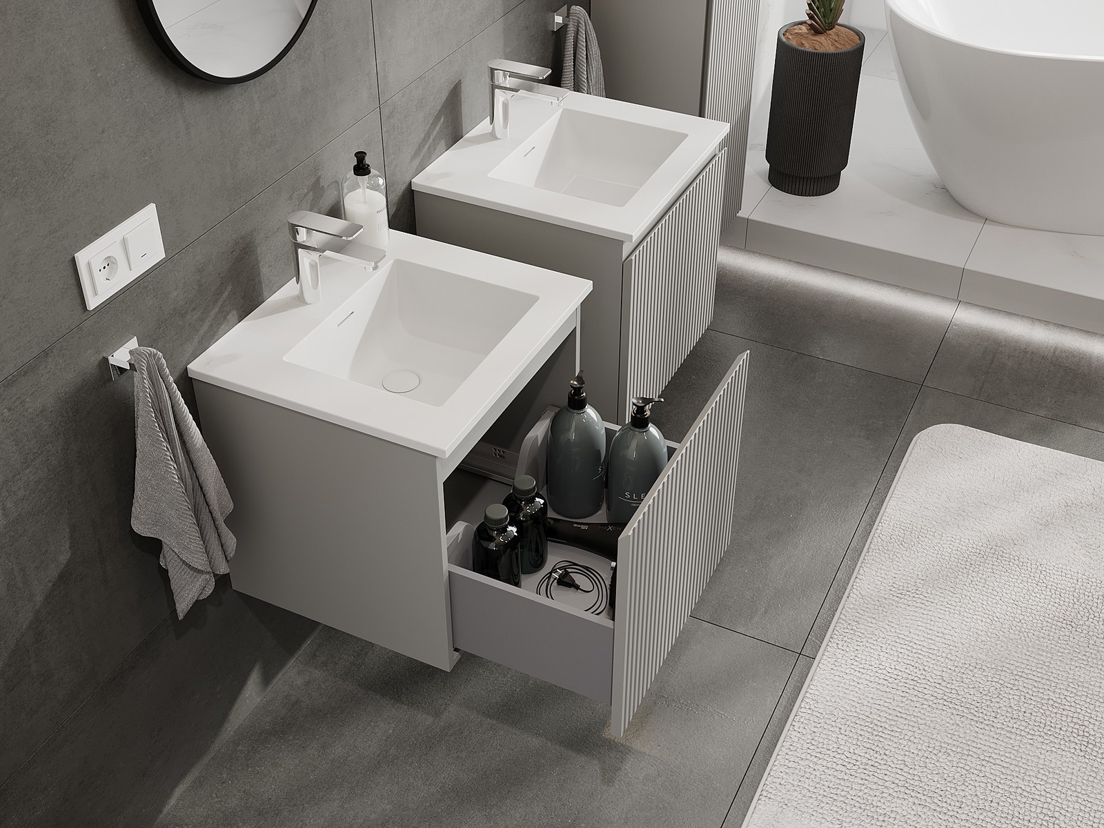 A moduláris fürdőszobabútorainkat különböző színkonfigurációkban lehet kombinálni, lehetővé téve a teljes személyre szabást. Kiválasztható mind az egyes elemek megjelenése, mind pedig funkciói, ami lehetővé teszi a bútorok személyes stílus- és használati preferenciákhoz való igazítását.