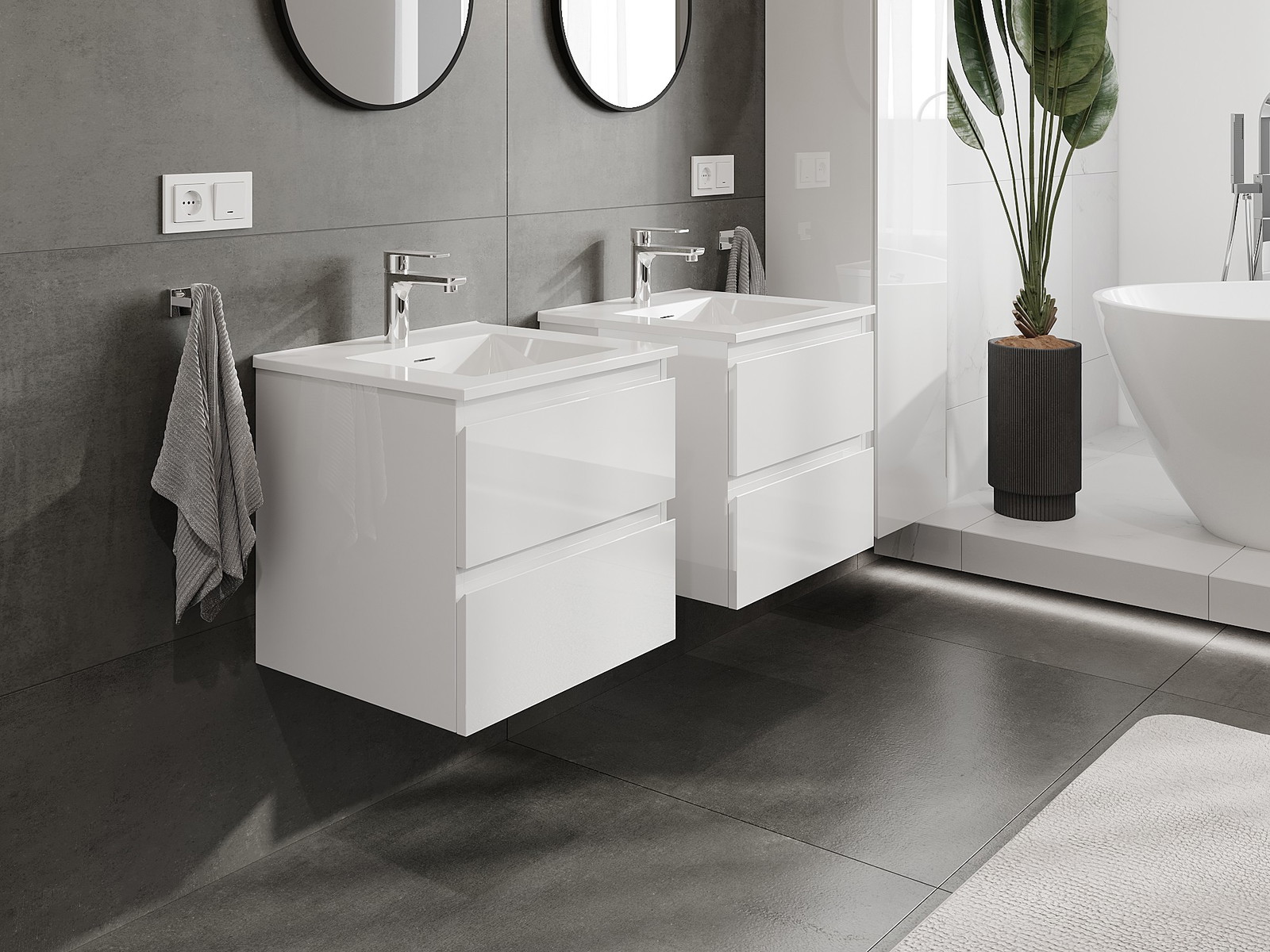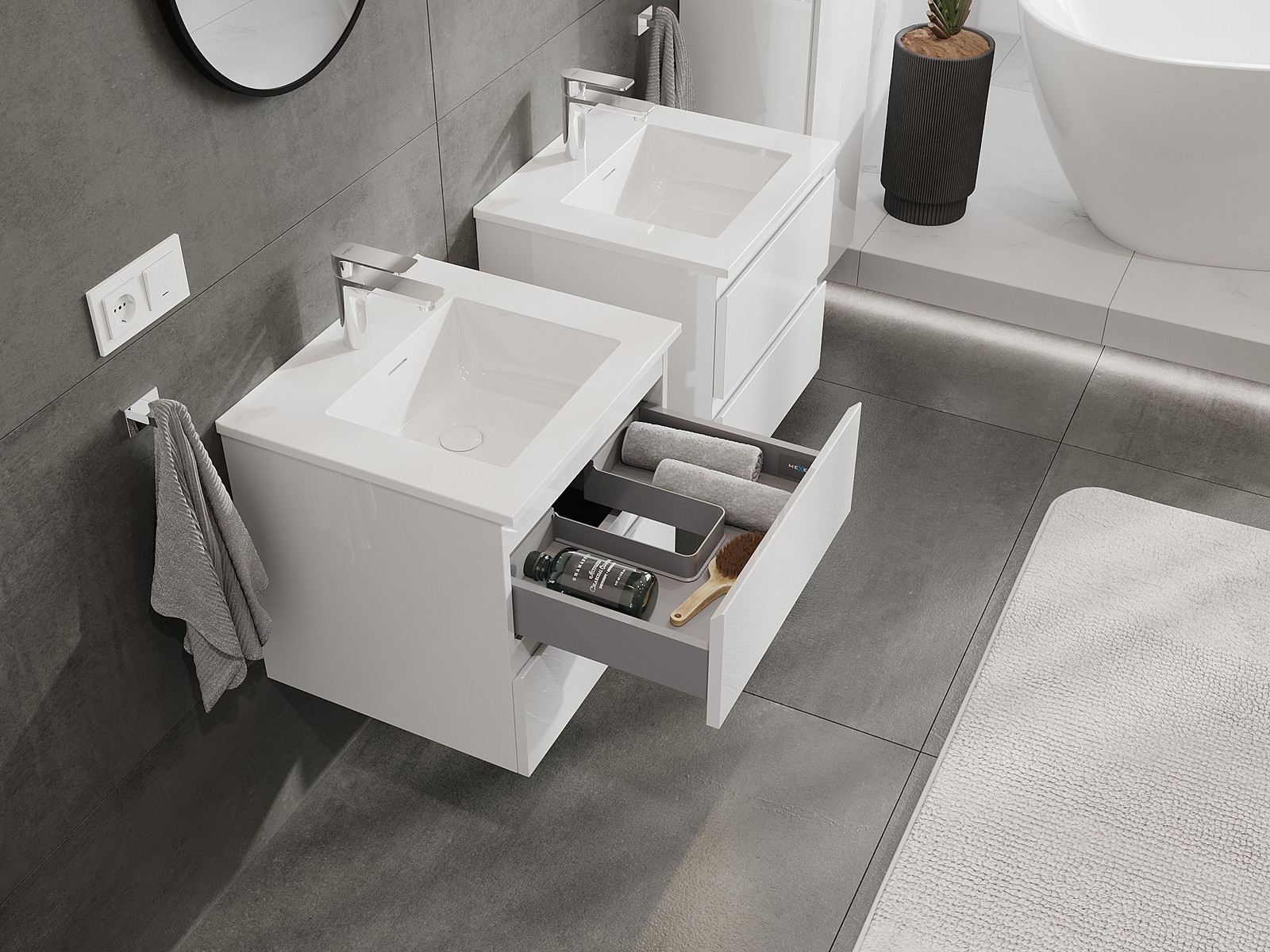 A moduláris fürdőszobabútorainkat különböző színkonfigurációkban lehet kombinálni, lehetővé téve a teljes személyre szabást. Kiválasztható mind az egyes elemek megjelenése, mind pedig funkciói, ami lehetővé teszi a bútorok személyes stílus- és használati preferenciákhoz való igazítását.