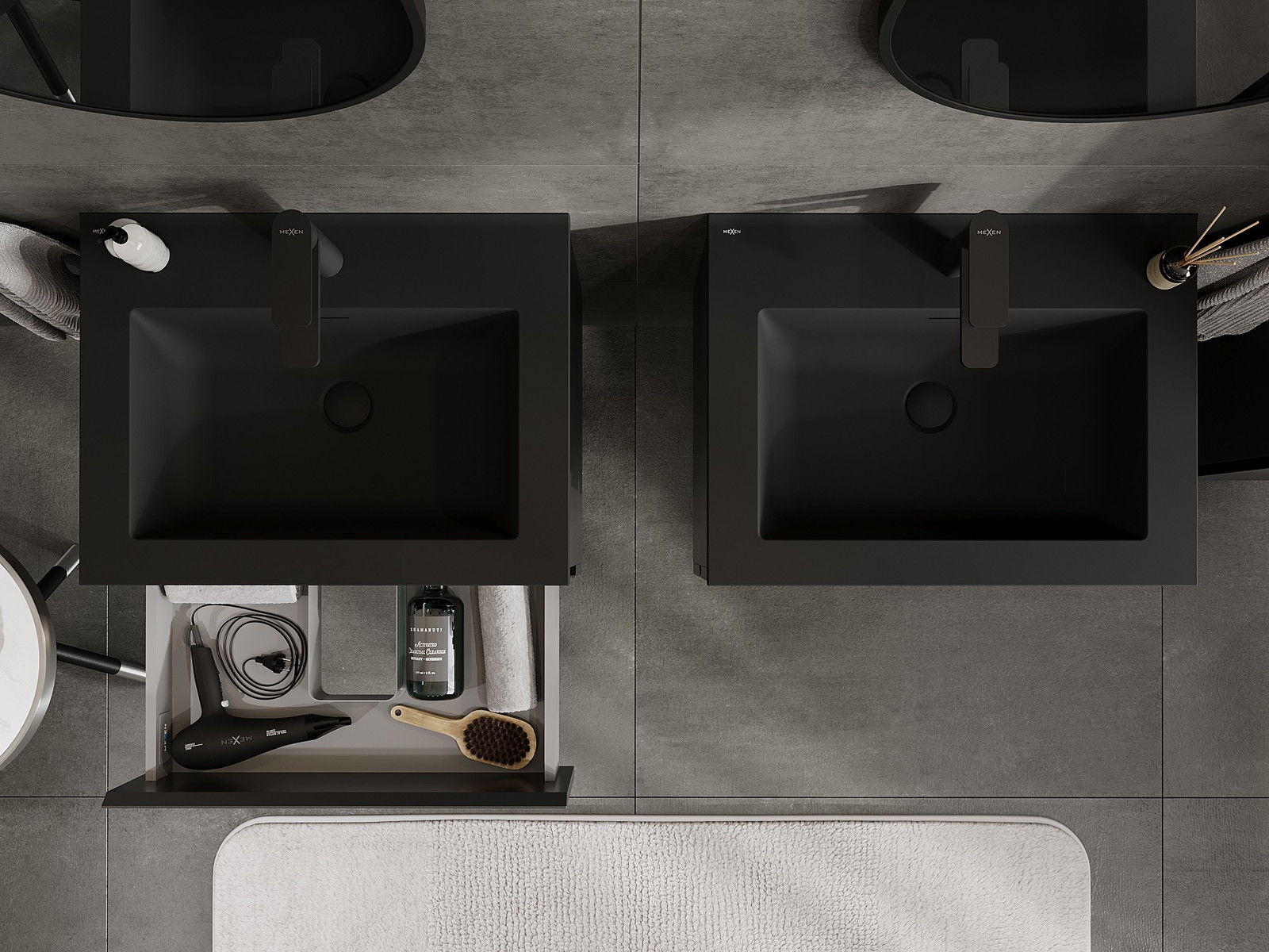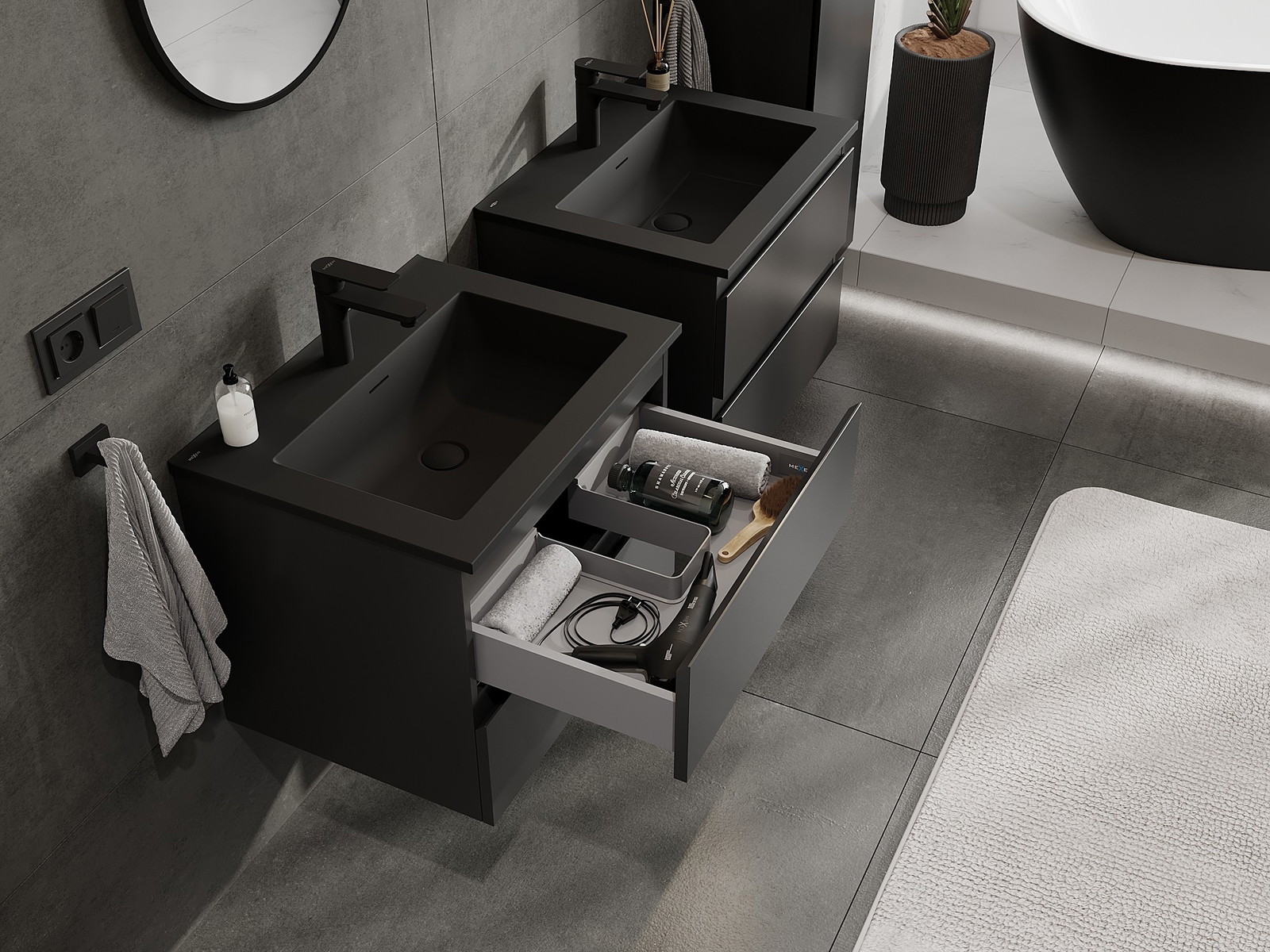 A fiókban lévő kivágás úgy van kialakítva, hogy befogadja a mosdó telepítéseknél szükséges szifont. Ennek köszönhetően a bútor teljesen funkcionálisan felszerelhető anélkül, hogy a fiók terének egy részét fel kellene áldozni a telepítés miatt.
