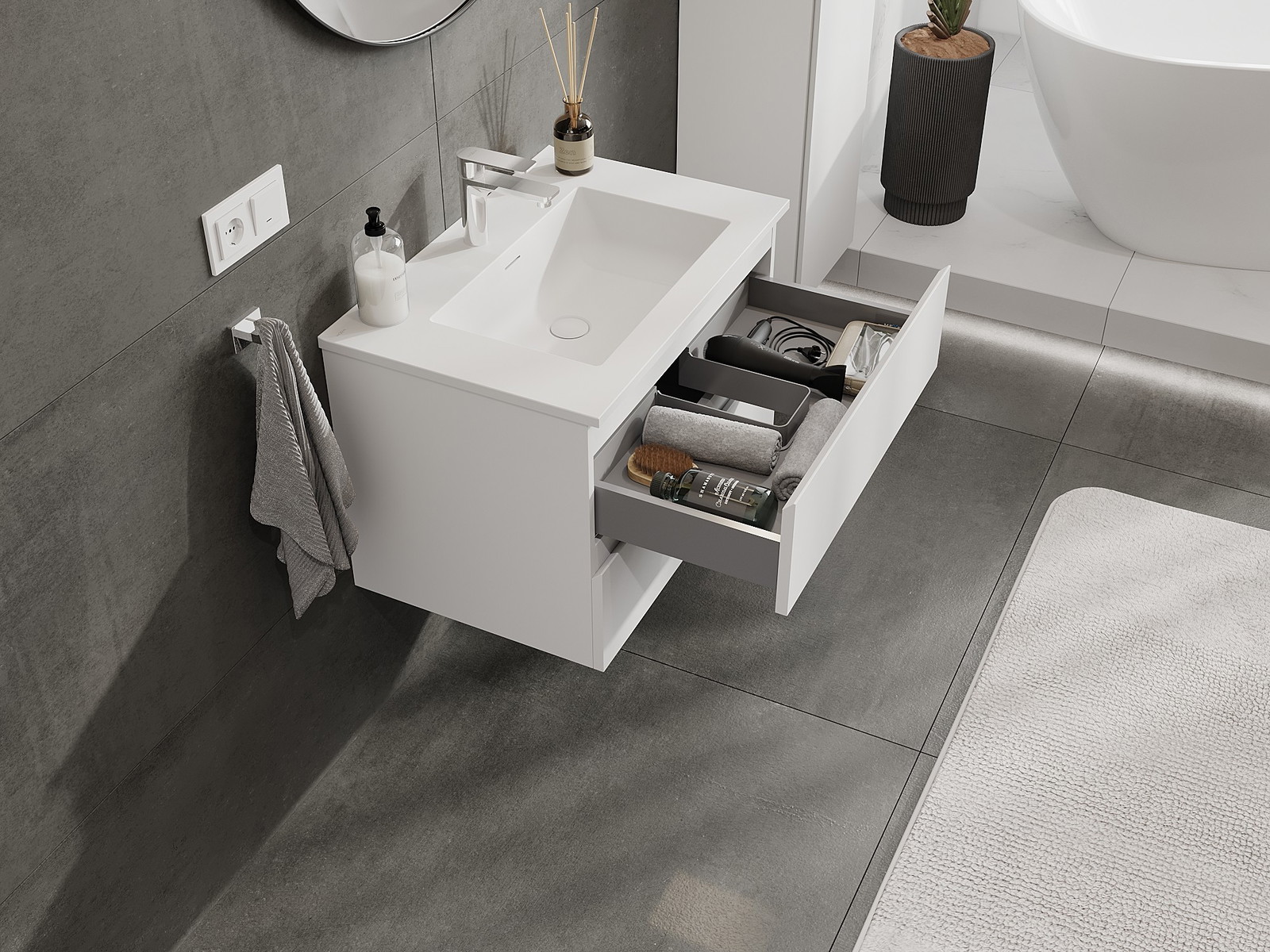 A fiókban lévő kivágás úgy van kialakítva, hogy befogadja a mosdó telepítéseknél szükséges szifont. Ennek köszönhetően a bútor teljesen funkcionálisan felszerelhető anélkül, hogy a fiók terének egy részét fel kellene áldozni a telepítés miatt.