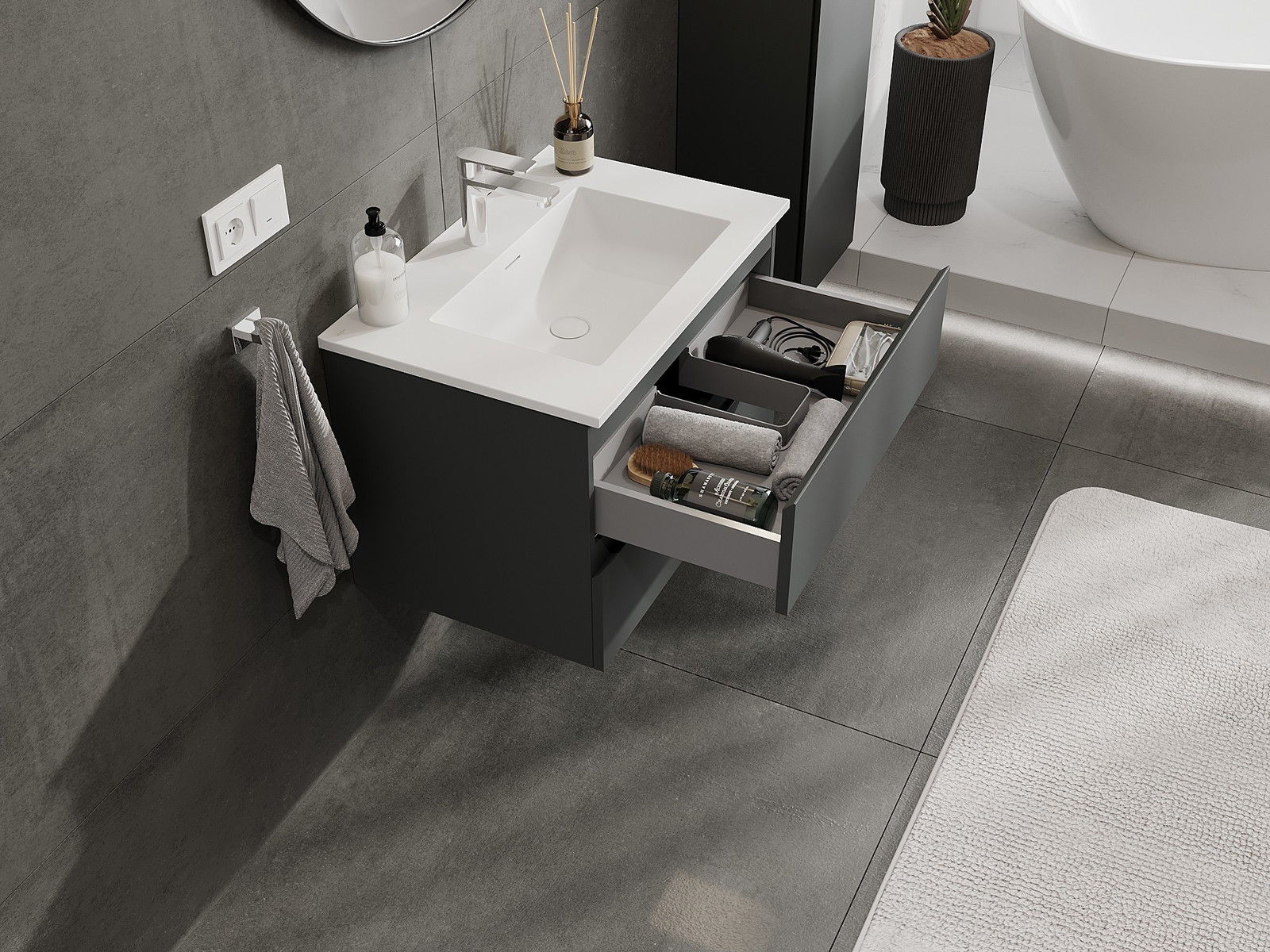 A fiókban lévő kivágás úgy van kialakítva, hogy befogadja a mosdó telepítéseknél szükséges szifont. Ennek köszönhetően a bútor teljesen funkcionálisan felszerelhető anélkül, hogy a fiók terének egy részét fel kellene áldozni a telepítés miatt.
