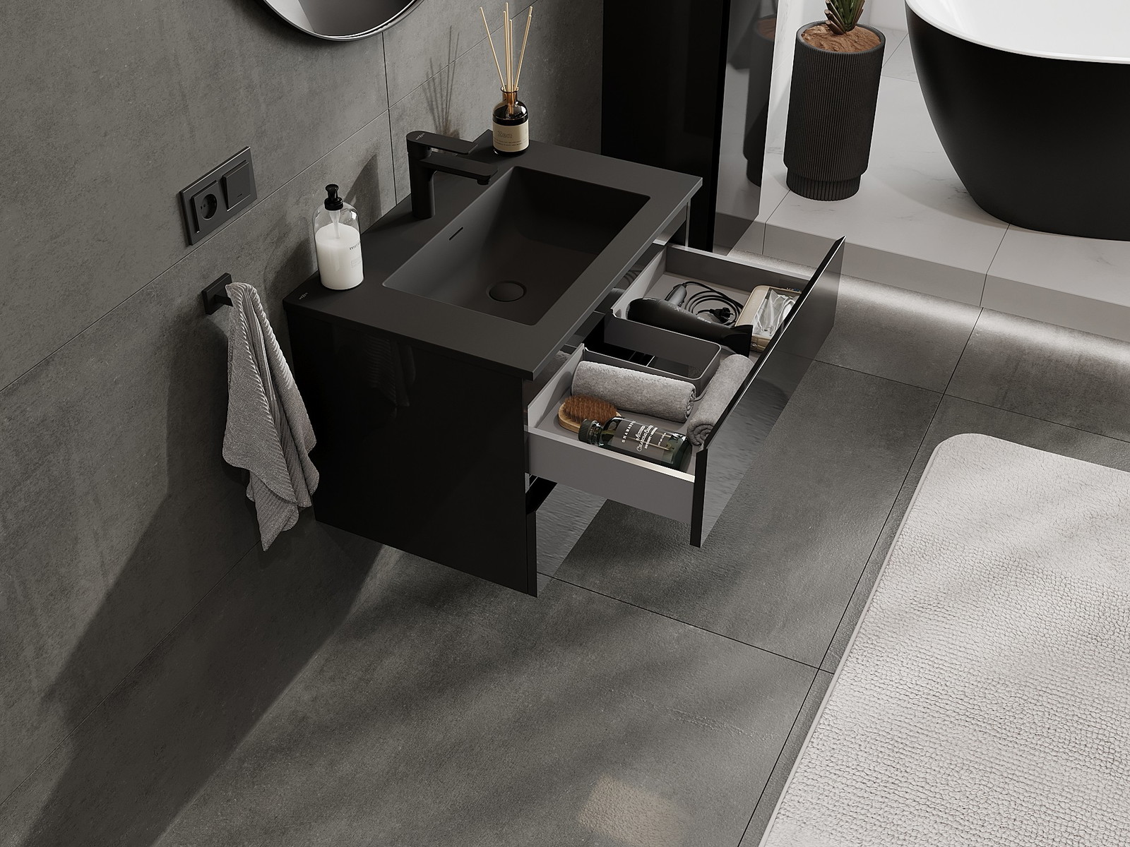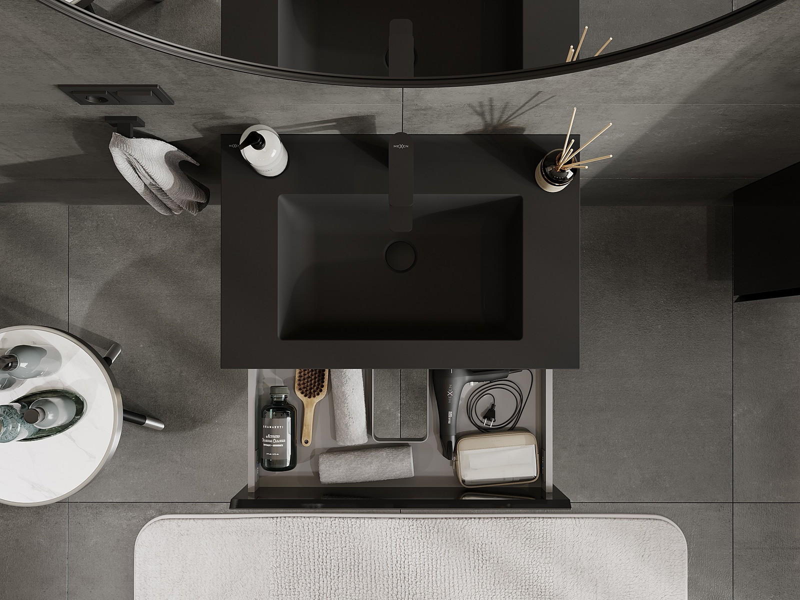 A fiókban lévő kivágás úgy van kialakítva, hogy befogadja a mosdó telepítéseknél szükséges szifont. Ennek köszönhetően a bútor teljesen funkcionálisan felszerelhető anélkül, hogy a fiók terének egy részét fel kellene áldozni a telepítés miatt.