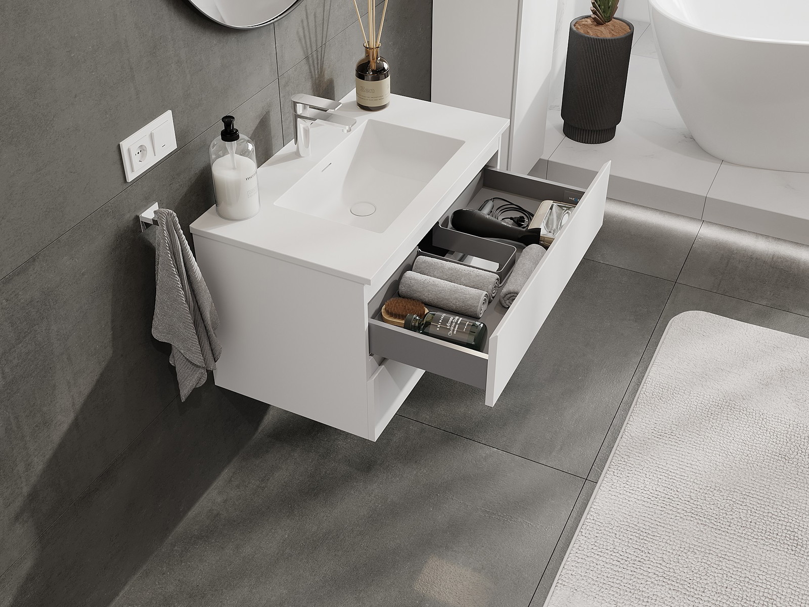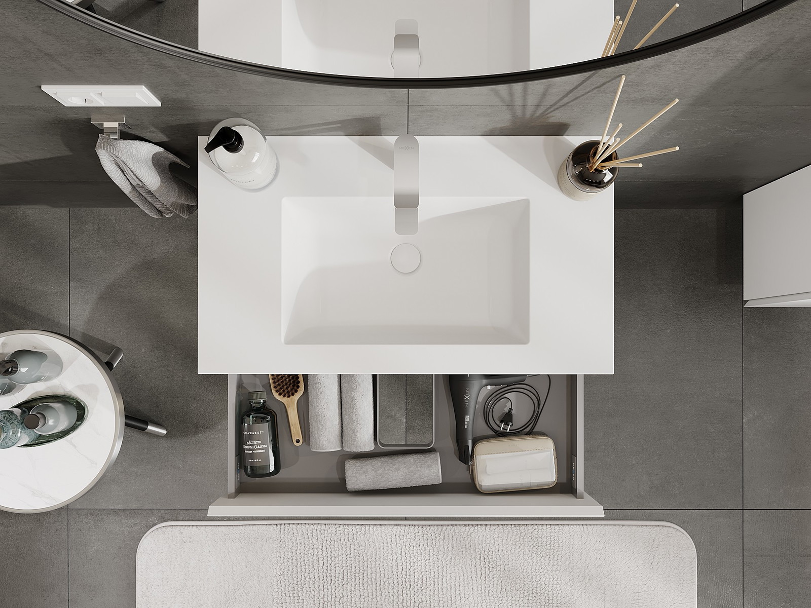 A fiókban lévő kivágás úgy van kialakítva, hogy befogadja a mosdó telepítéseknél szükséges szifont. Ennek köszönhetően a bútor teljesen funkcionálisan felszerelhető anélkül, hogy a fiók terének egy részét fel kellene áldozni a telepítés miatt.