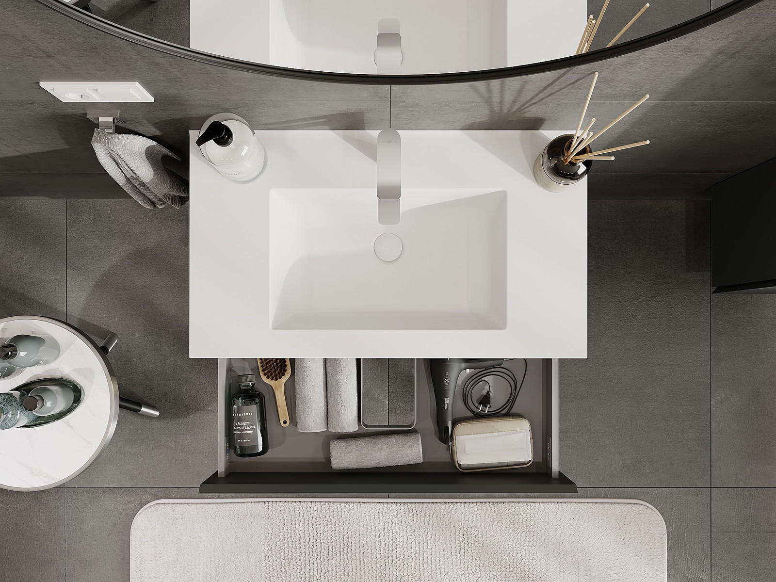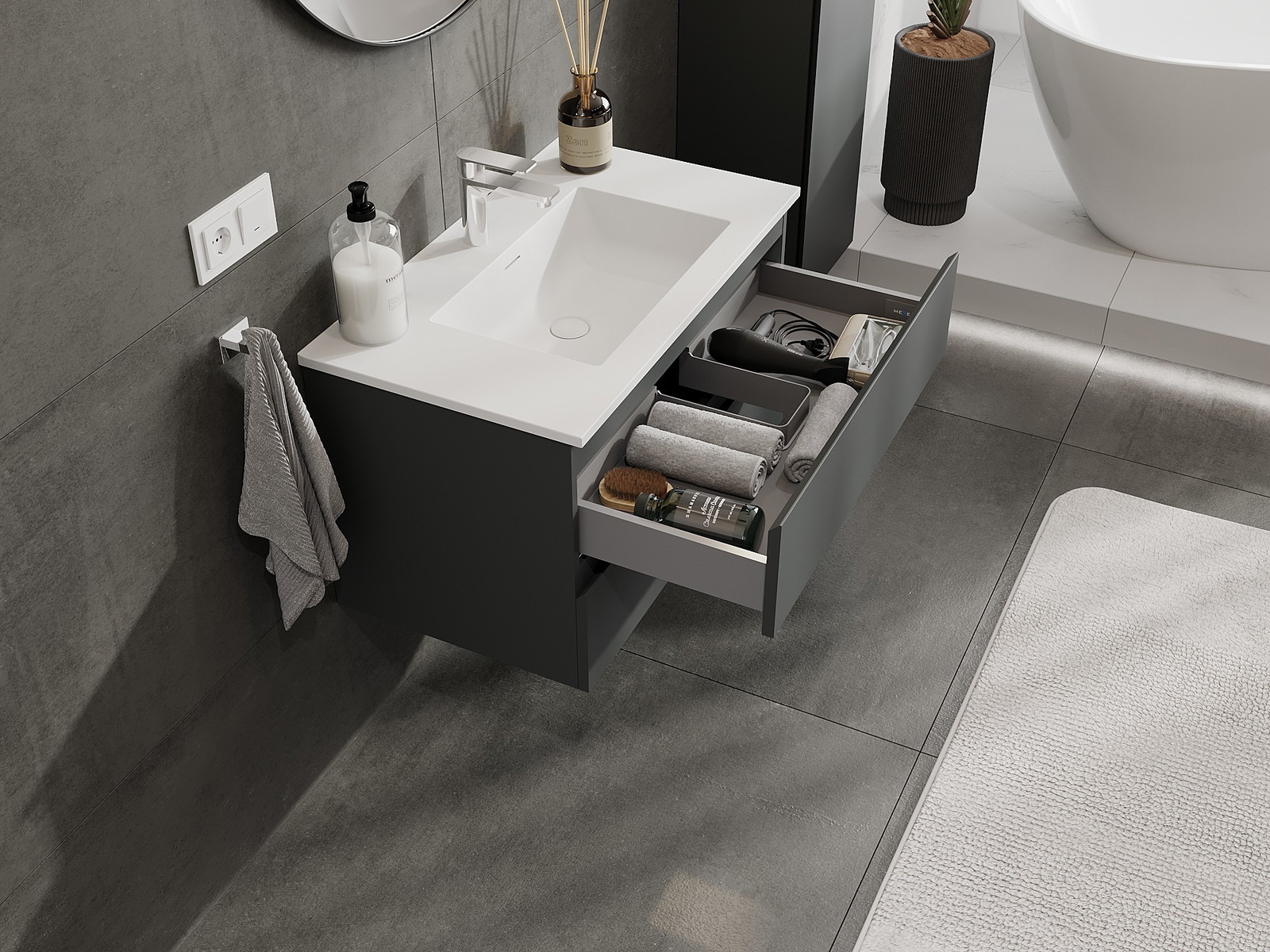 A fiókban lévő kivágás úgy van kialakítva, hogy befogadja a mosdó telepítéseknél szükséges szifont. Ennek köszönhetően a bútor teljesen funkcionálisan felszerelhető anélkül, hogy a fiók terének egy részét fel kellene áldozni a telepítés miatt.