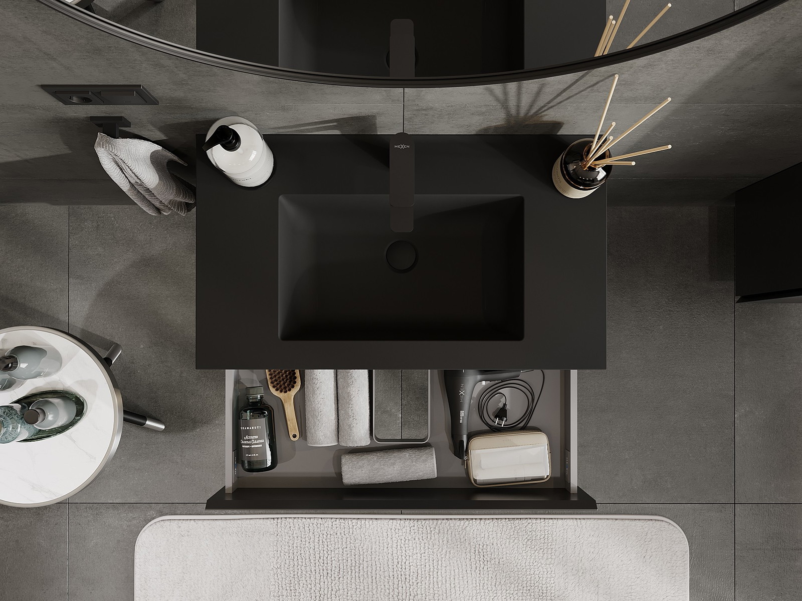 A fiókban lévő kivágás úgy van kialakítva, hogy befogadja a mosdó telepítéseknél szükséges szifont. Ennek köszönhetően a bútor teljesen funkcionálisan felszerelhető anélkül, hogy a fiók terének egy részét fel kellene áldozni a telepítés miatt.
