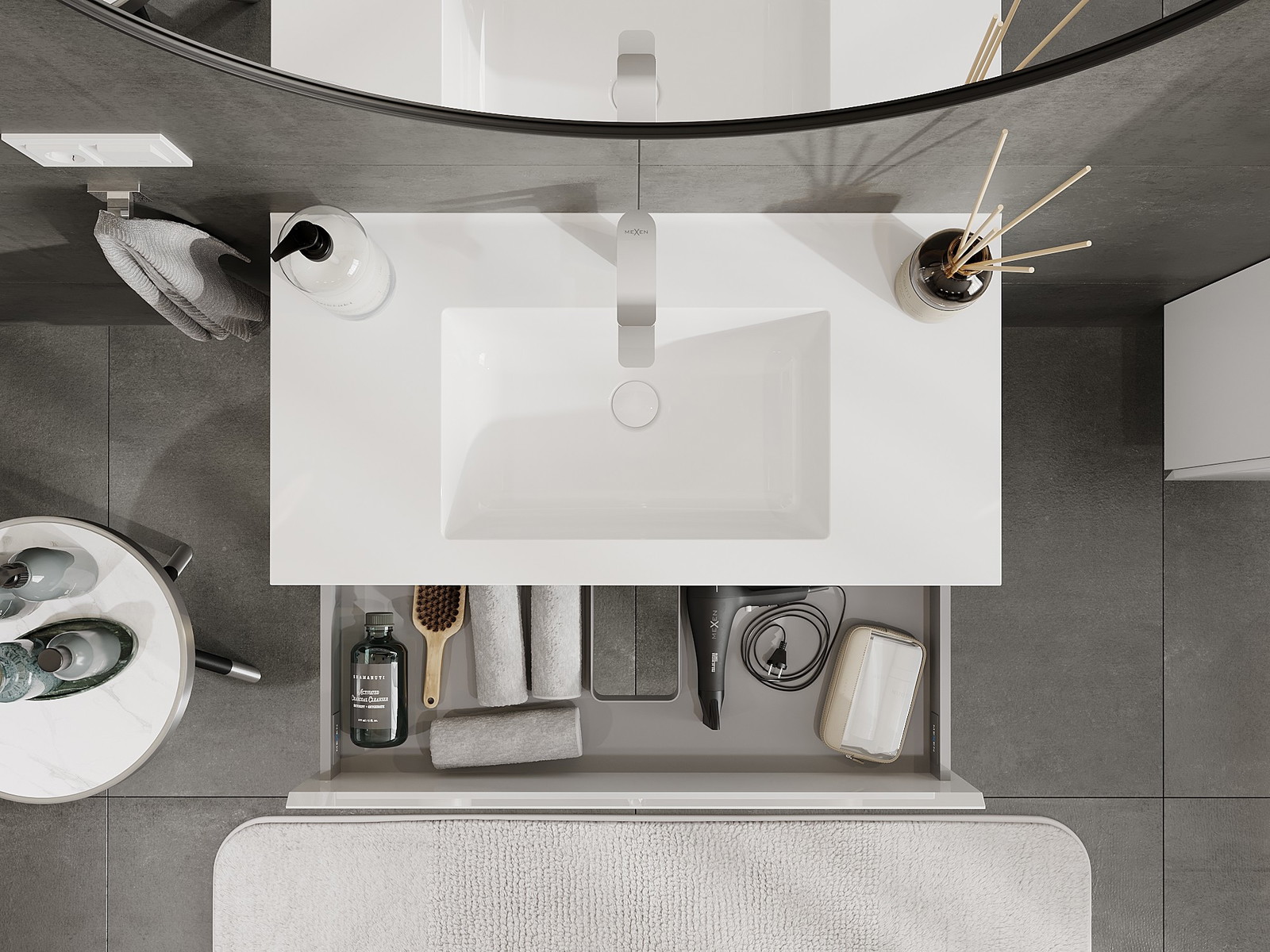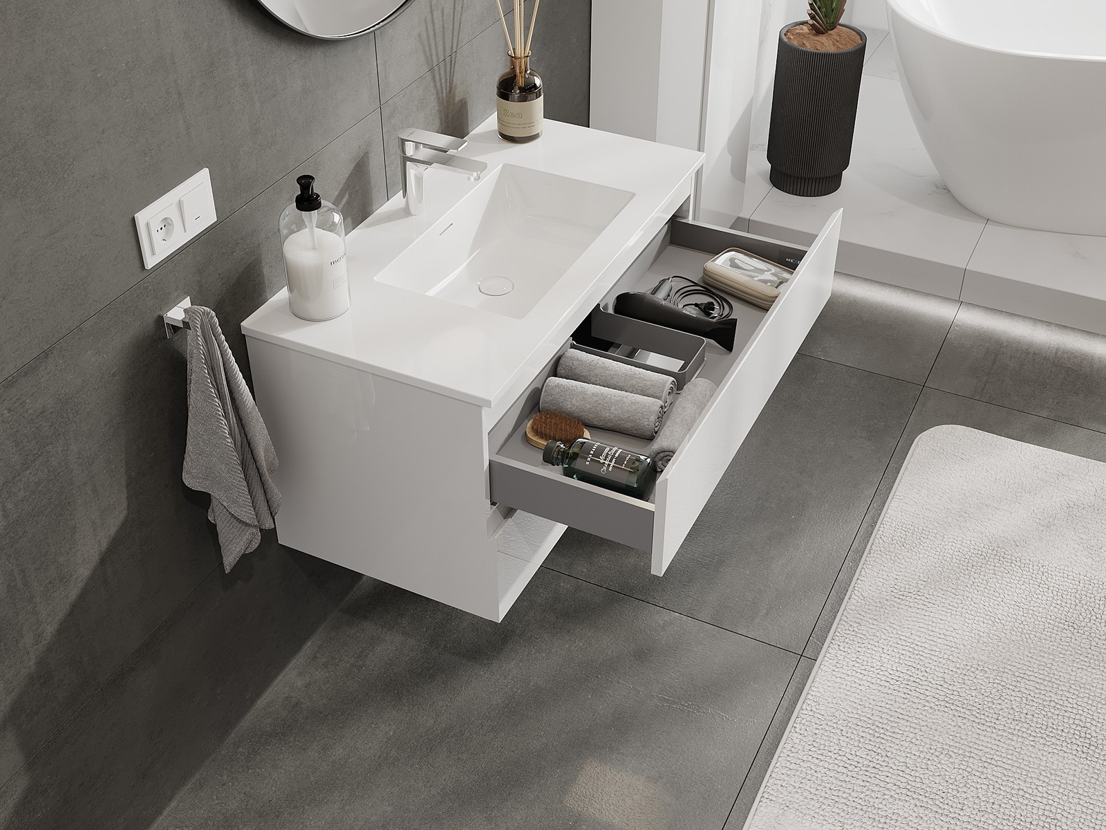 A fiókban lévő kivágás úgy van kialakítva, hogy befogadja a mosdó telepítéseknél szükséges szifont. Ennek köszönhetően a bútor teljesen funkcionálisan felszerelhető anélkül, hogy a fiók terének egy részét fel kellene áldozni a telepítés miatt.