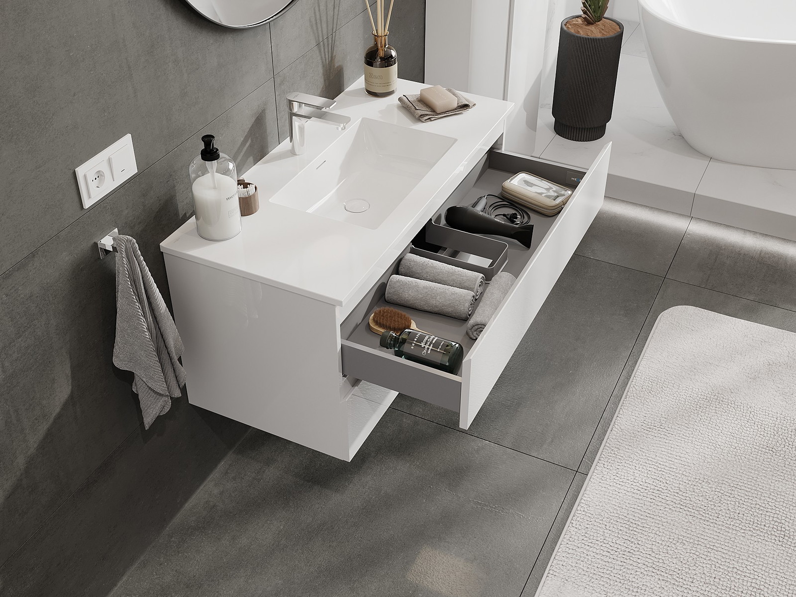 A fiókban lévő kivágás úgy van kialakítva, hogy befogadja a mosdó telepítéseknél szükséges szifont. Ennek köszönhetően a bútor teljesen funkcionálisan felszerelhető anélkül, hogy a fiók terének egy részét fel kellene áldozni a telepítés miatt.