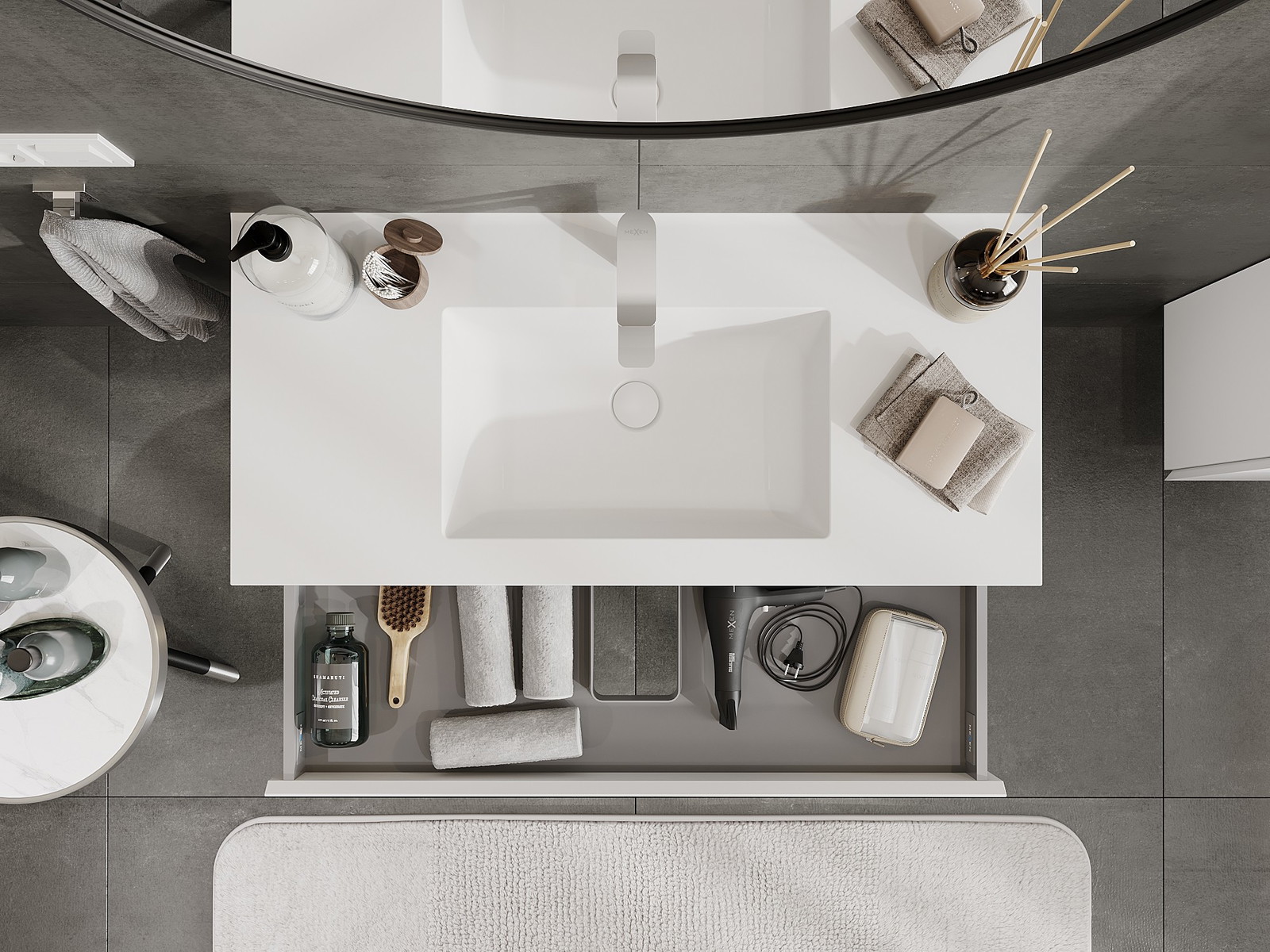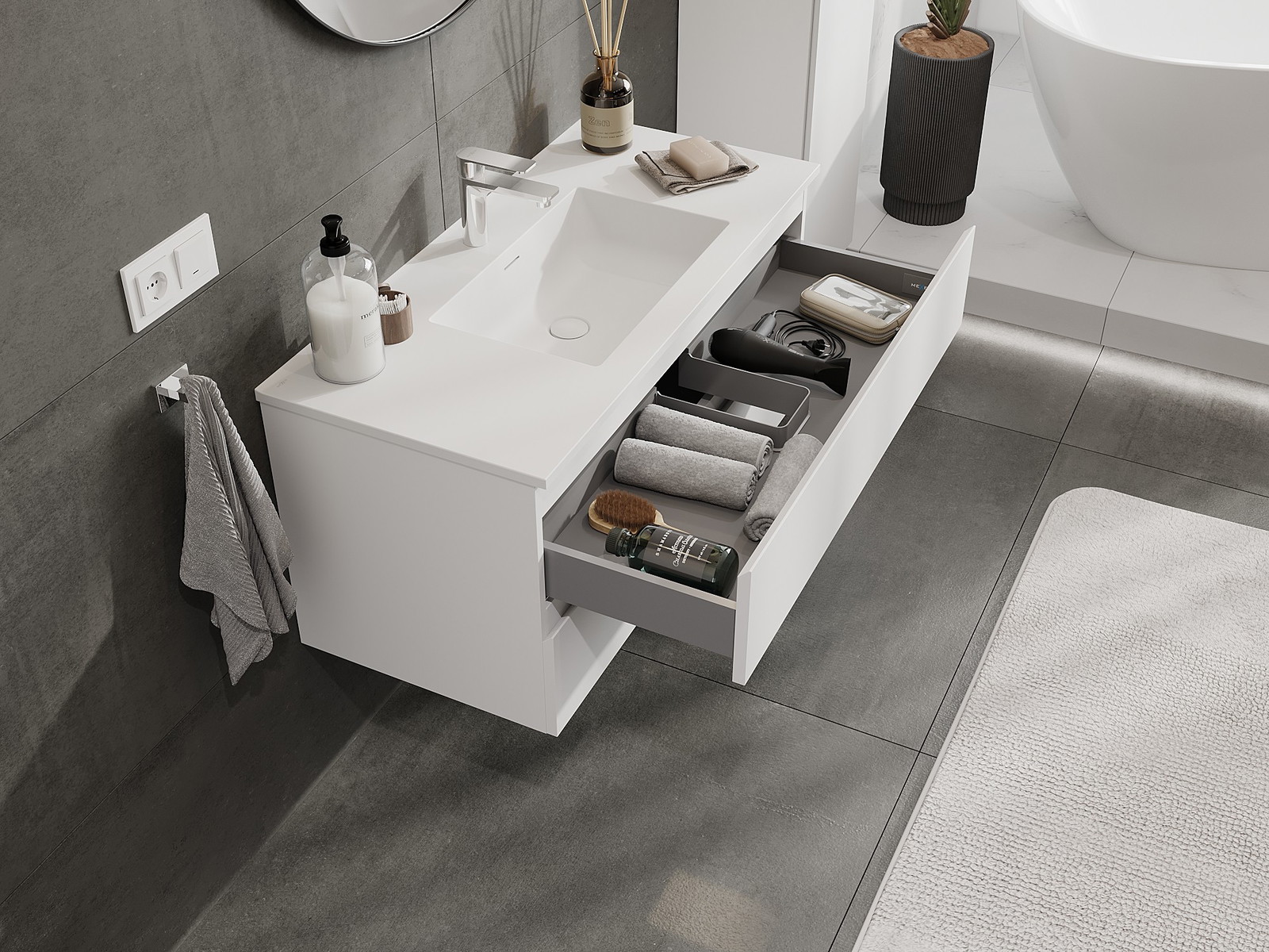 A fiókban lévő kivágás úgy van kialakítva, hogy befogadja a mosdó telepítéseknél szükséges szifont. Ennek köszönhetően a bútor teljesen funkcionálisan felszerelhető anélkül, hogy a fiók terének egy részét fel kellene áldozni a telepítés miatt.
