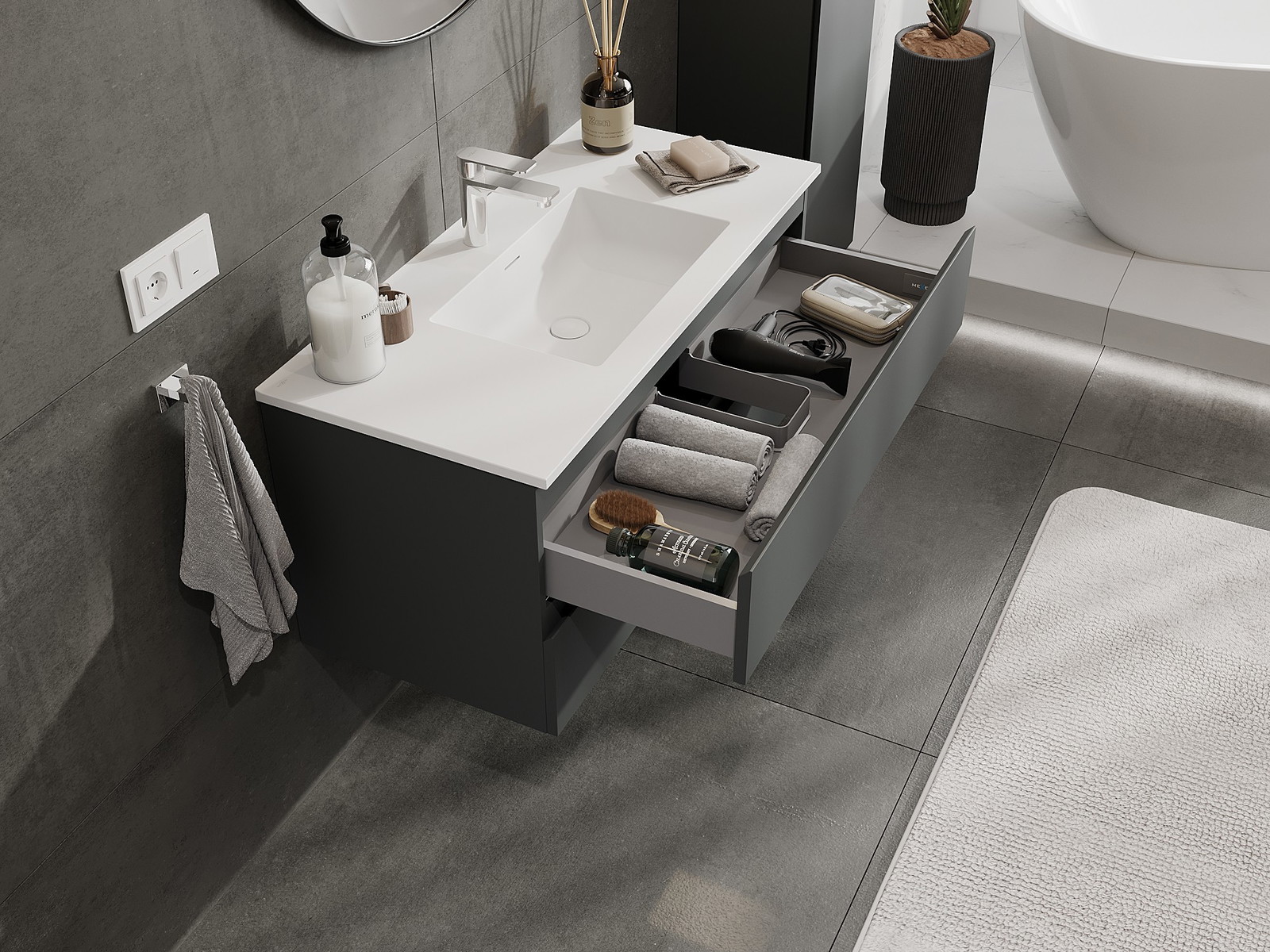 A moduláris fürdőszobabútorainkat különböző színkonfigurációkban lehet kombinálni, lehetővé téve a teljes személyre szabást. Kiválasztható mind az egyes elemek megjelenése, mind pedig funkciói, ami lehetővé teszi a bútorok személyes stílus- és használati preferenciákhoz való igazítását.