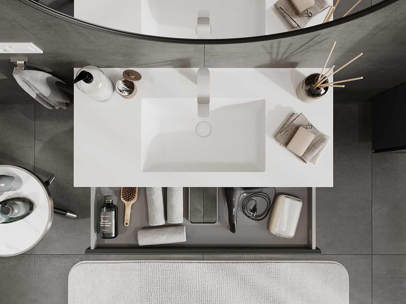A fiókban lévő kivágás úgy van kialakítva, hogy befogadja a mosdó telepítéseknél szükséges szifont. Ennek köszönhetően a bútor teljesen funkcionálisan felszerelhető anélkül, hogy a fiók terének egy részét fel kellene áldozni a telepítés miatt.