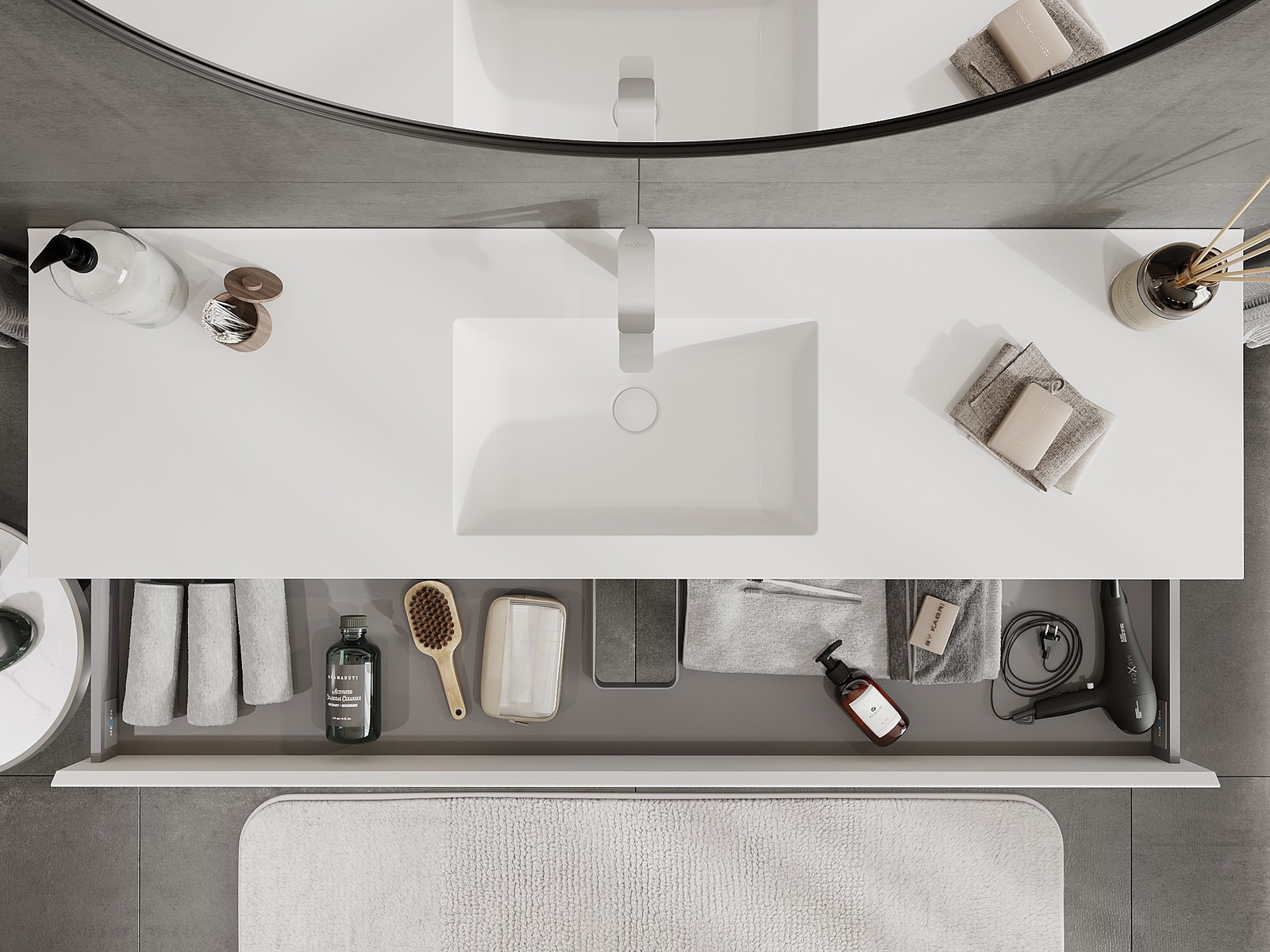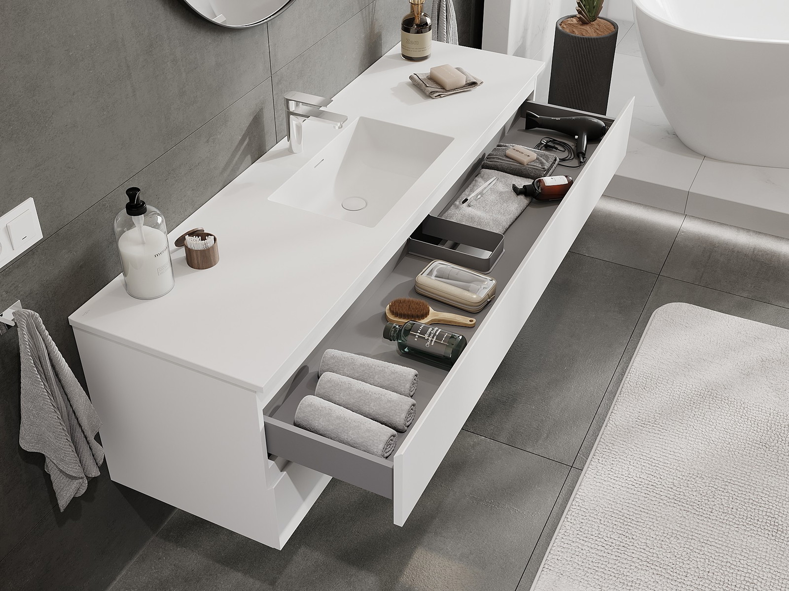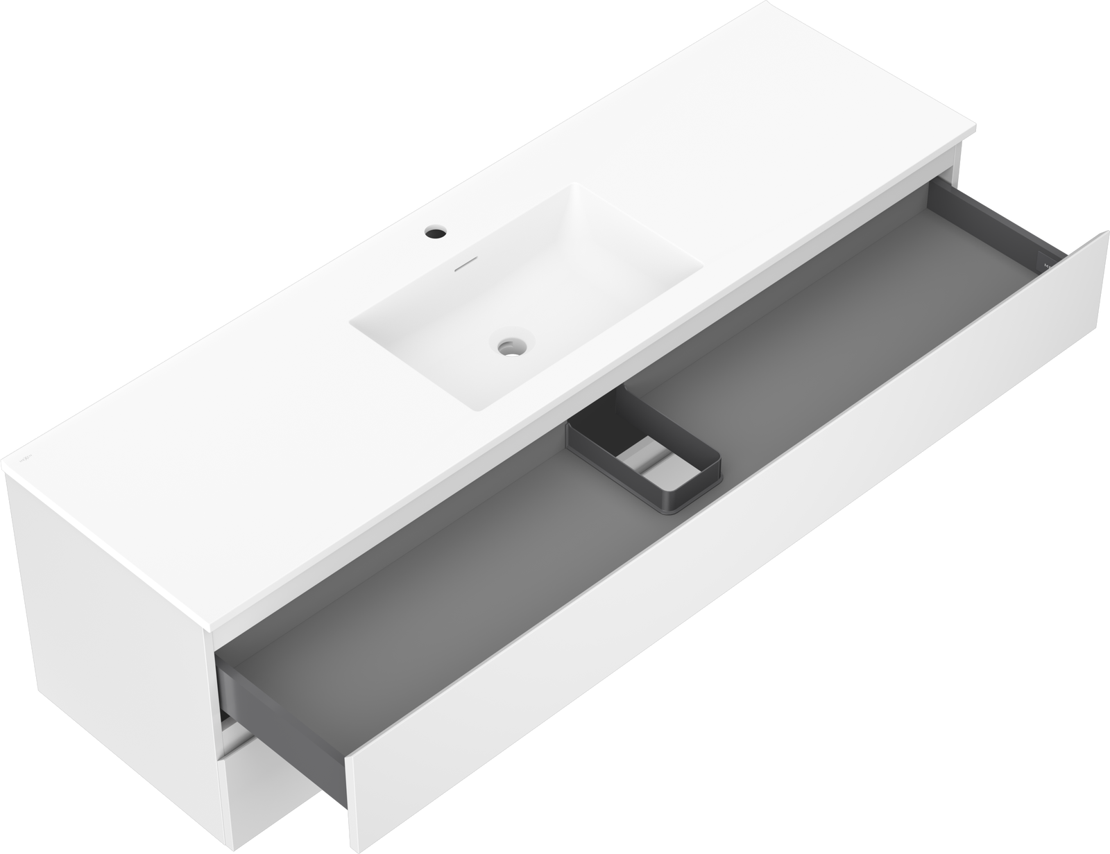 A fiókban lévő kivágás úgy van kialakítva, hogy befogadja a mosdó telepítéseknél szükséges szifont. Ennek köszönhetően a bútor teljesen funkcionálisan felszerelhető anélkül, hogy a fiók terének egy részét fel kellene áldozni a telepítés miatt.