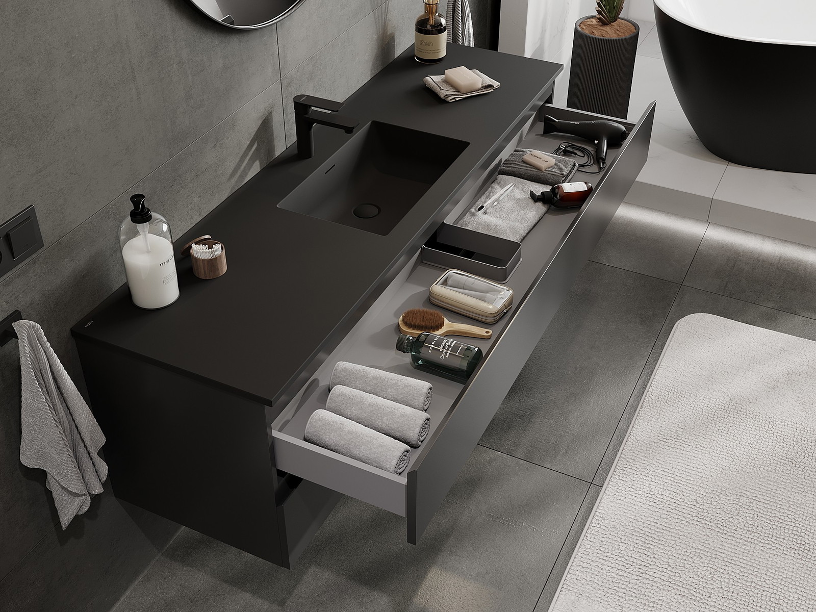 A moduláris fürdőszobabútorainkat különböző színkonfigurációkban lehet kombinálni, lehetővé téve a teljes személyre szabást. Kiválasztható mind az egyes elemek megjelenése, mind pedig funkciói, ami lehetővé teszi a bútorok személyes stílus- és használati preferenciákhoz való igazítását.