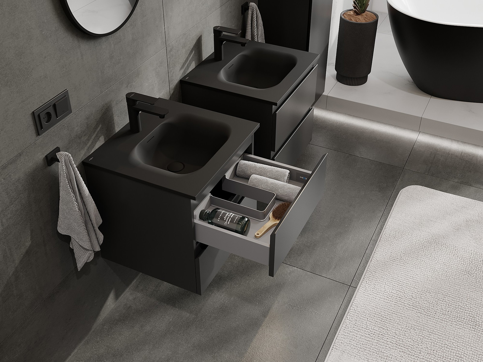 A fiókban lévő kivágás úgy van kialakítva, hogy befogadja a mosdó telepítéseknél szükséges szifont. Ennek köszönhetően a bútor teljesen funkcionálisan felszerelhető anélkül, hogy a fiók terének egy részét fel kellene áldozni a telepítés miatt.