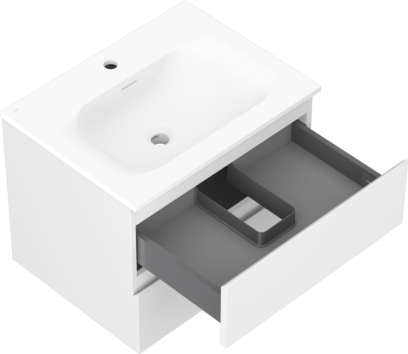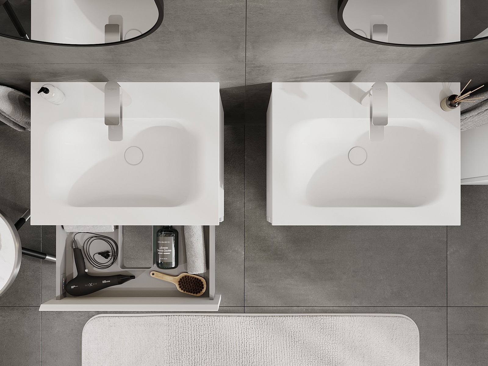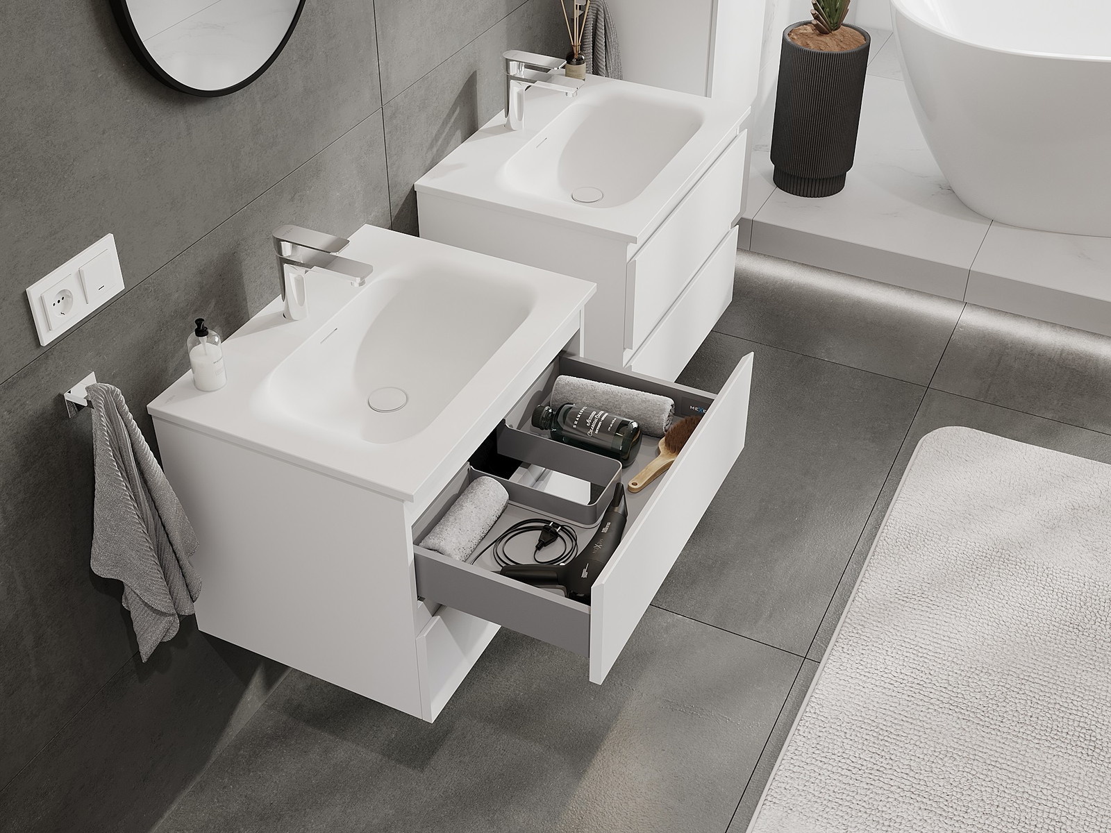 A fiókban lévő kivágás úgy van kialakítva, hogy befogadja a mosdó telepítéseknél szükséges szifont. Ennek köszönhetően a bútor teljesen funkcionálisan felszerelhető anélkül, hogy a fiók terének egy részét fel kellene áldozni a telepítés miatt.