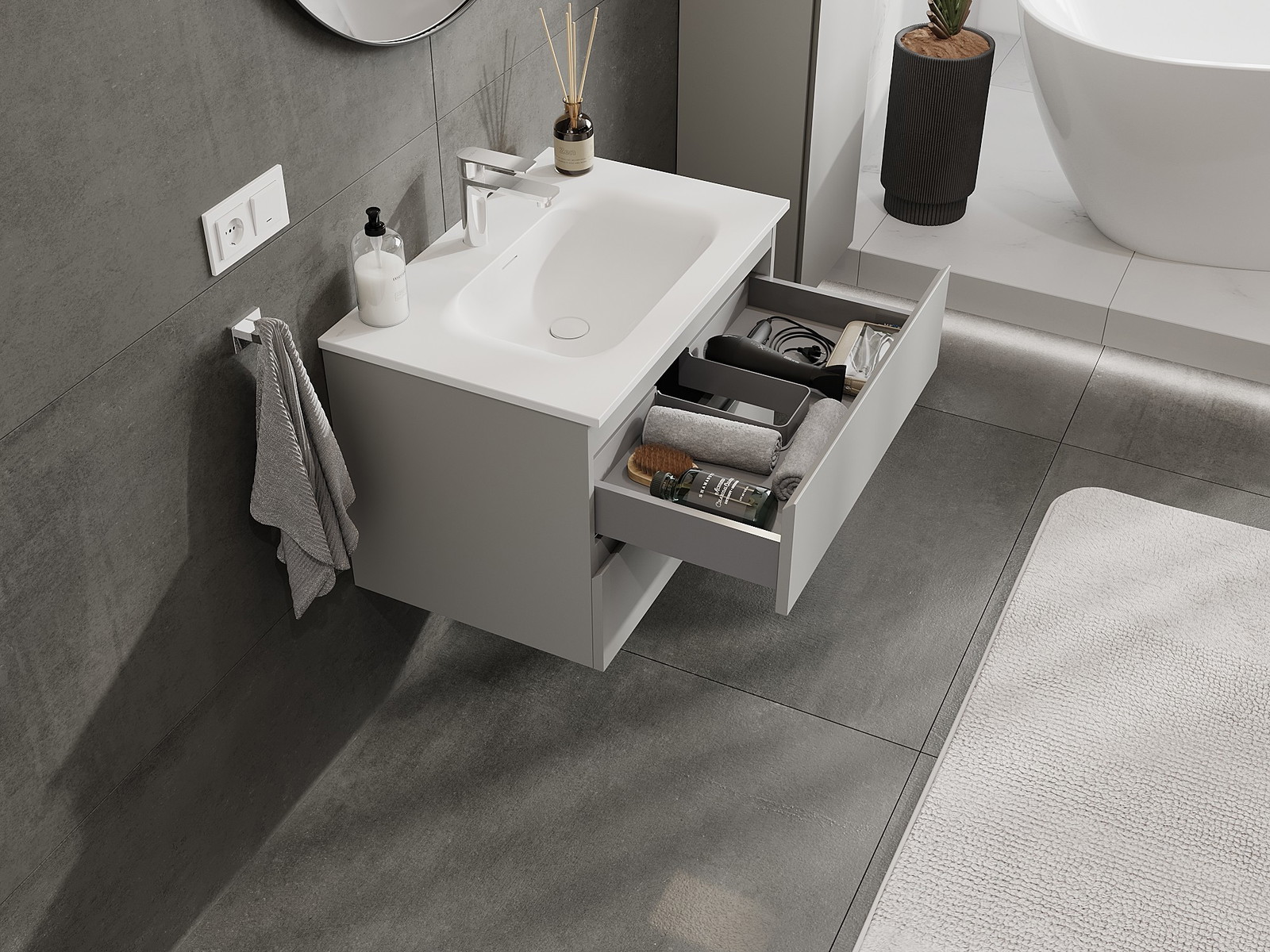 A fiókban lévő kivágás úgy van kialakítva, hogy befogadja a mosdó telepítéseknél szükséges szifont. Ennek köszönhetően a bútor teljesen funkcionálisan felszerelhető anélkül, hogy a fiók terének egy részét fel kellene áldozni a telepítés miatt.