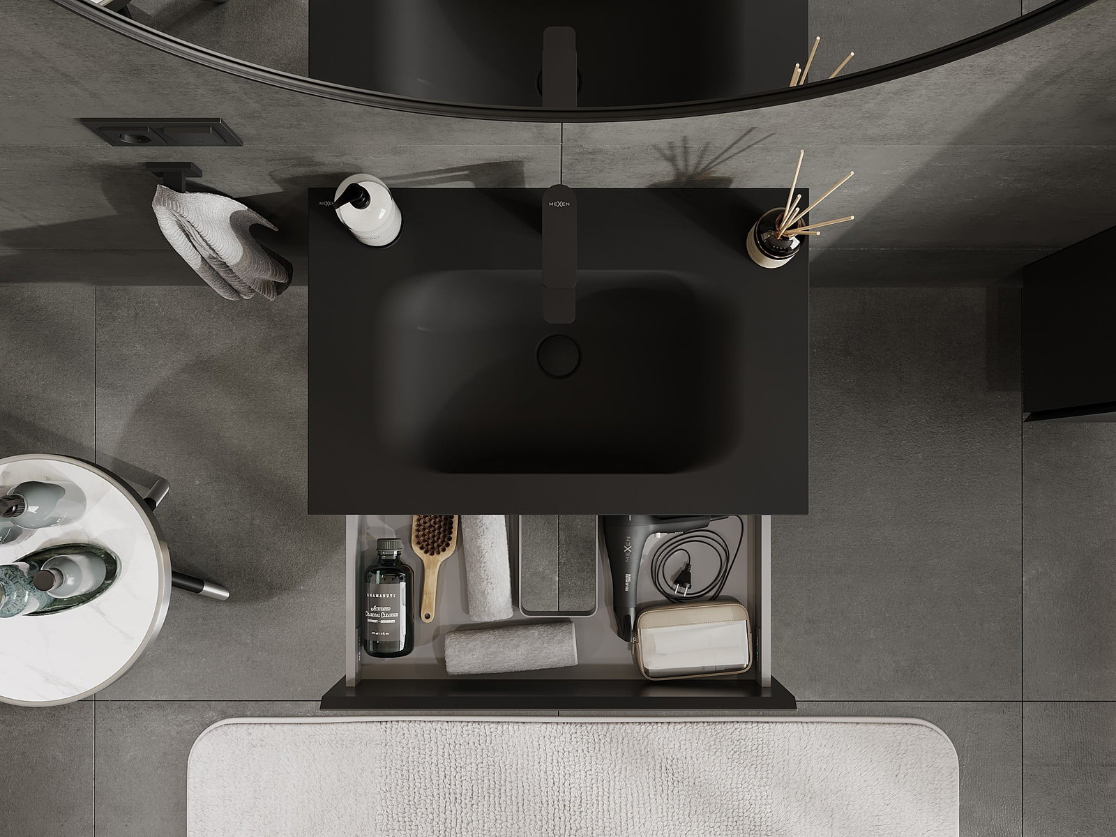 A fiókban lévő kivágás úgy van kialakítva, hogy befogadja a mosdó telepítéseknél szükséges szifont. Ennek köszönhetően a bútor teljesen funkcionálisan felszerelhető anélkül, hogy a fiók terének egy részét fel kellene áldozni a telepítés miatt.