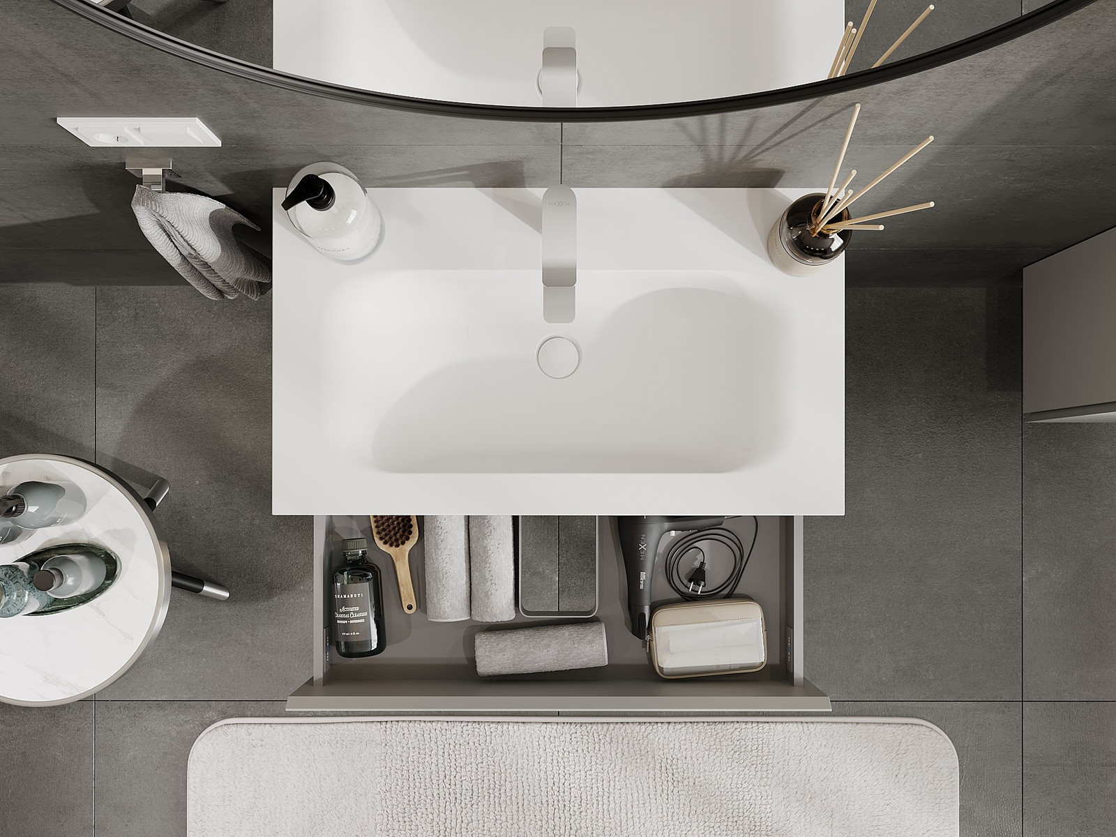 A fiókban lévő kivágás úgy van kialakítva, hogy befogadja a mosdó telepítéseknél szükséges szifont. Ennek köszönhetően a bútor teljesen funkcionálisan felszerelhető anélkül, hogy a fiók terének egy részét fel kellene áldozni a telepítés miatt.