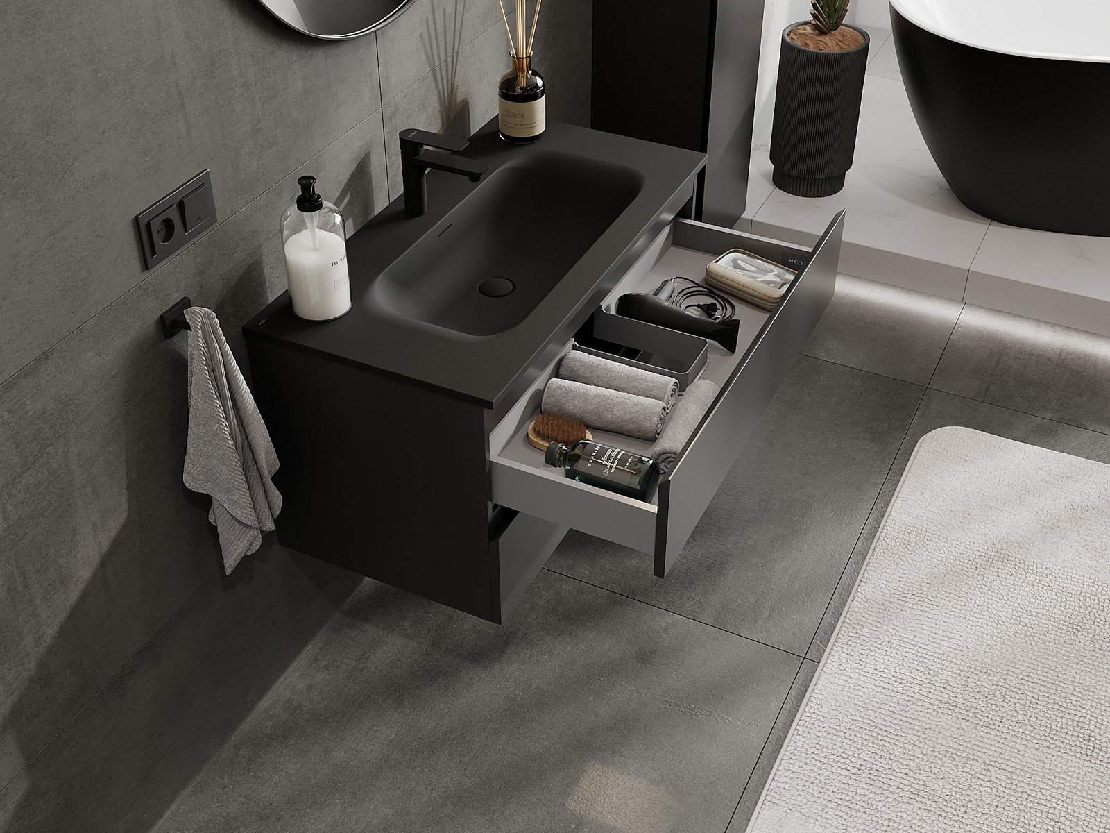 A fiókban lévő kivágás úgy van kialakítva, hogy befogadja a mosdó telepítéseknél szükséges szifont. Ennek köszönhetően a bútor teljesen funkcionálisan felszerelhető anélkül, hogy a fiók terének egy részét fel kellene áldozni a telepítés miatt.