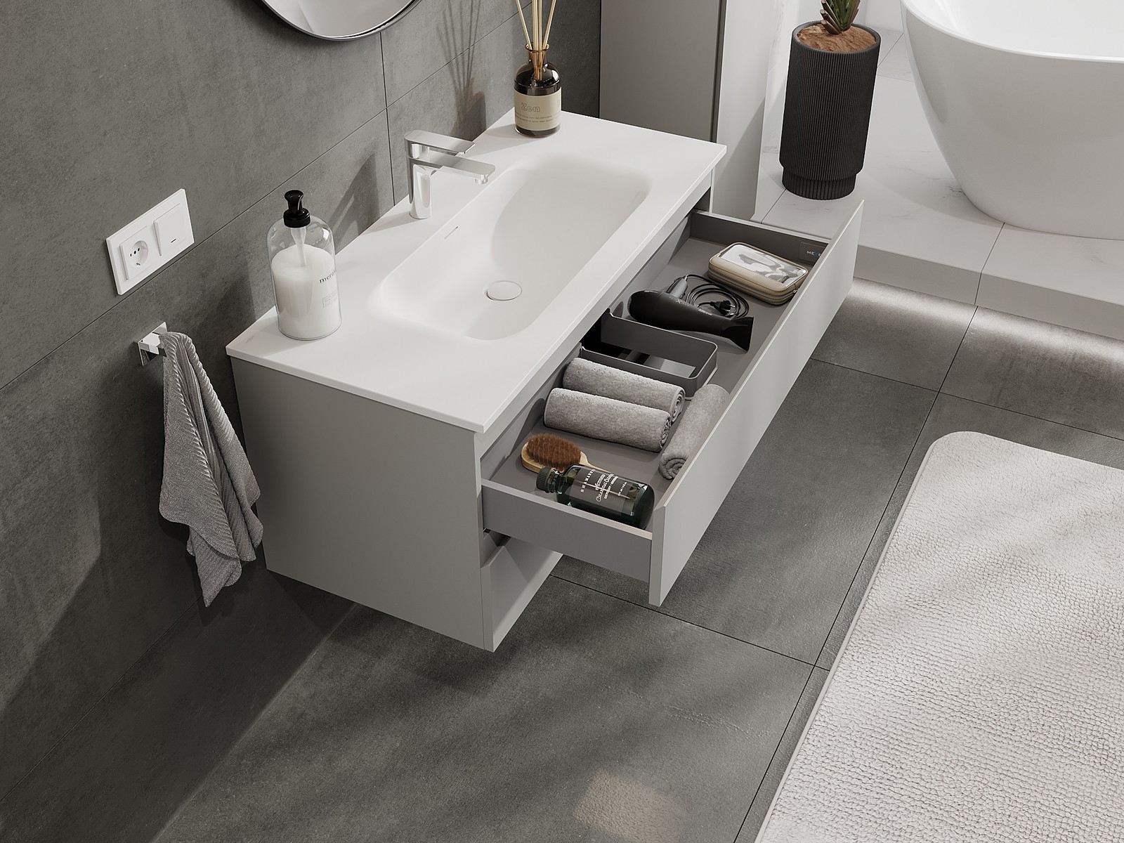 A fiókban lévő kivágás úgy van kialakítva, hogy befogadja a mosdó telepítéseknél szükséges szifont. Ennek köszönhetően a bútor teljesen funkcionálisan felszerelhető anélkül, hogy a fiók terének egy részét fel kellene áldozni a telepítés miatt.