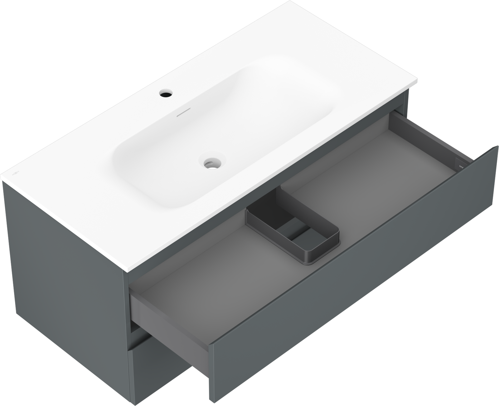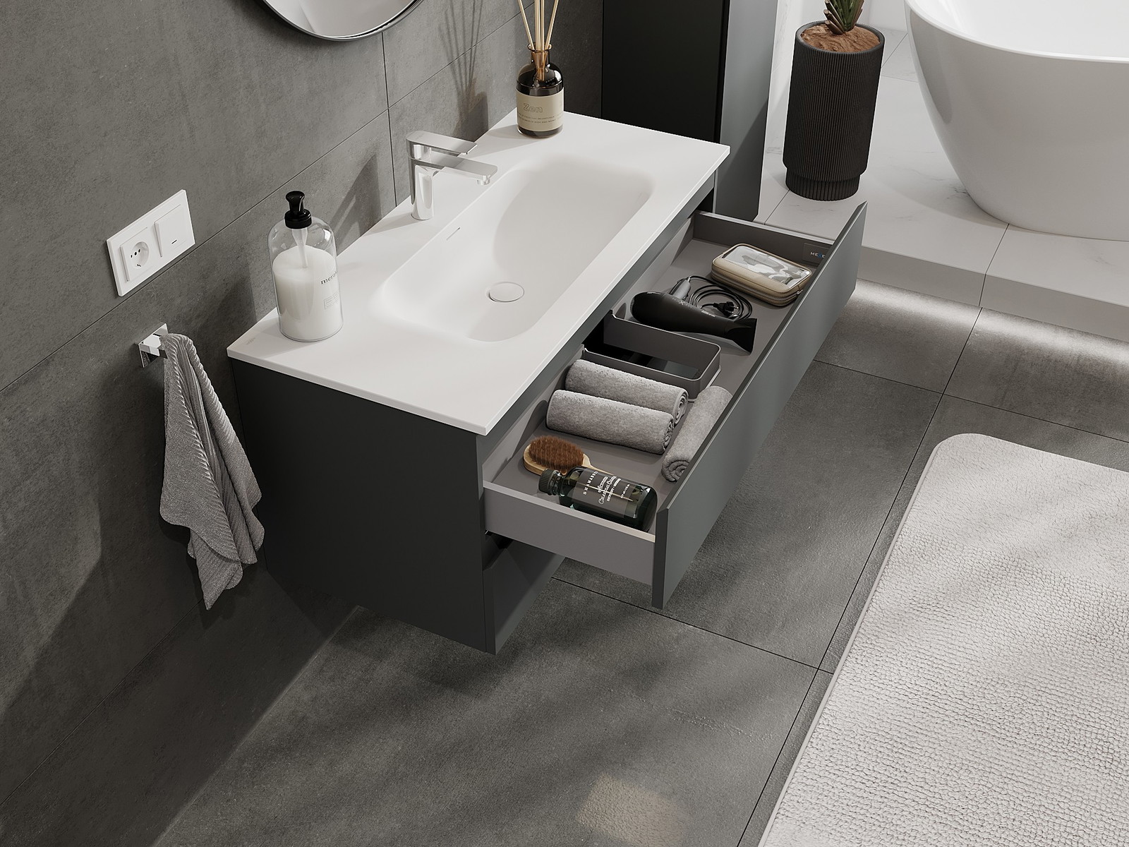 A fiókban lévő kivágás úgy van kialakítva, hogy befogadja a mosdó telepítéseknél szükséges szifont. Ennek köszönhetően a bútor teljesen funkcionálisan felszerelhető anélkül, hogy a fiók terének egy részét fel kellene áldozni a telepítés miatt.