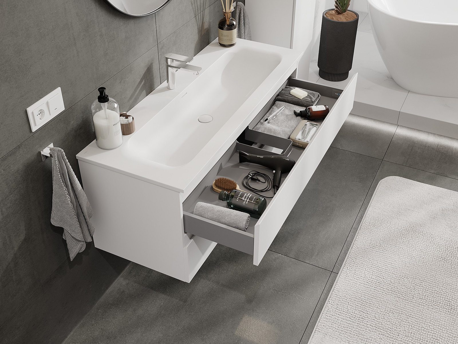 A fiókban lévő kivágás úgy van kialakítva, hogy befogadja a mosdó telepítéseknél szükséges szifont. Ennek köszönhetően a bútor teljesen funkcionálisan felszerelhető anélkül, hogy a fiók terének egy részét fel kellene áldozni a telepítés miatt.