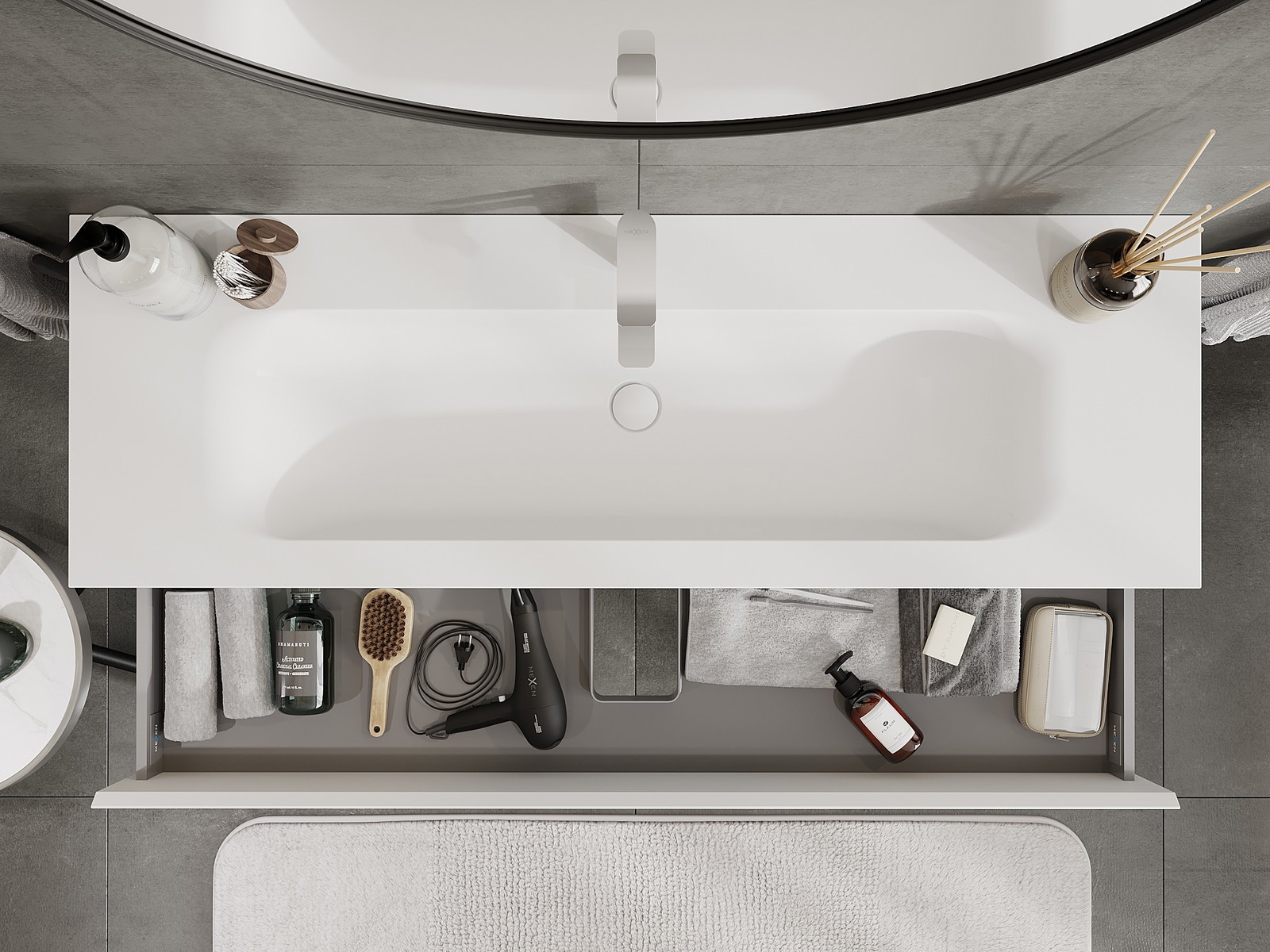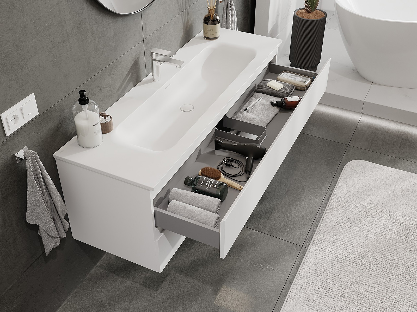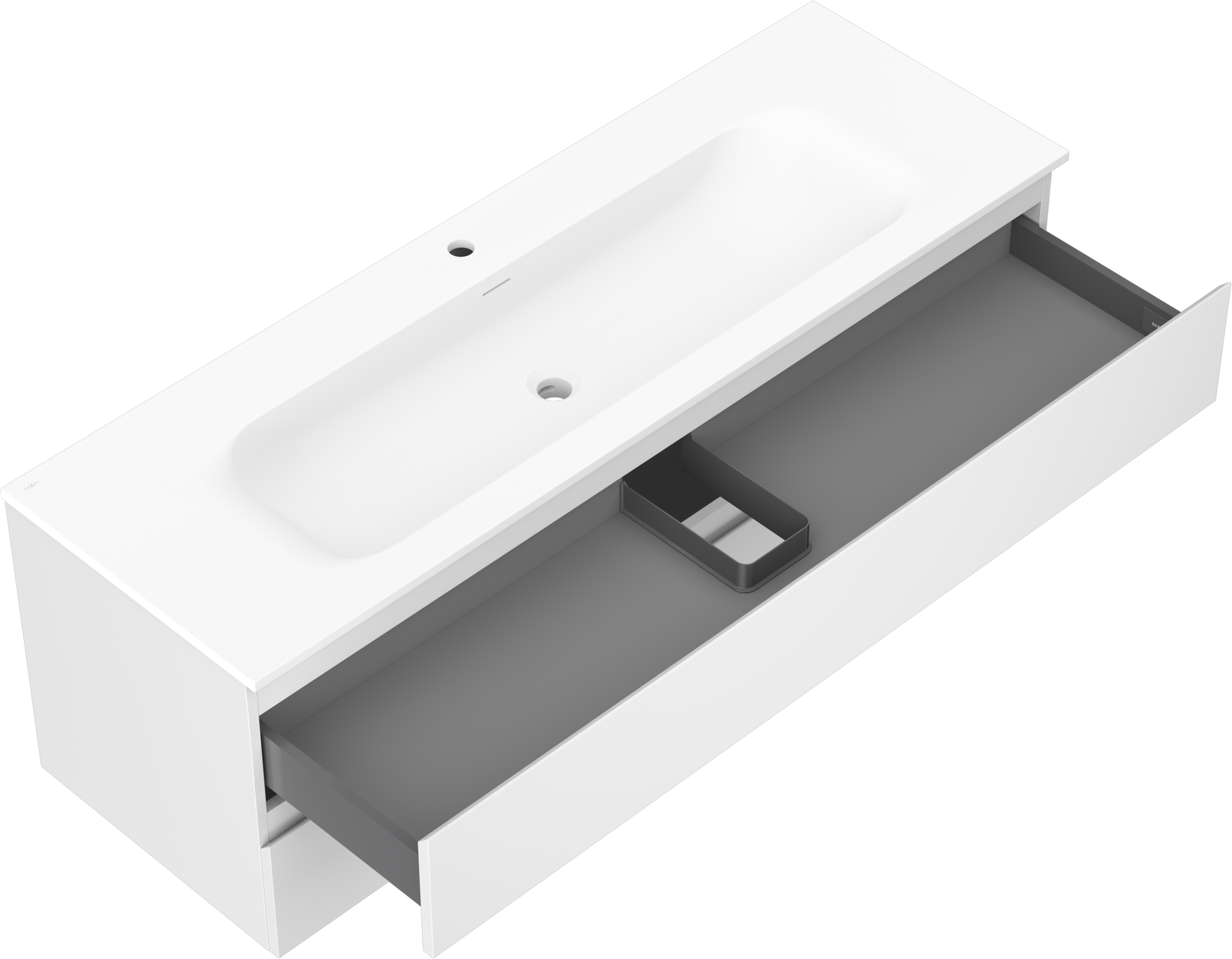 A fiókban lévő kivágás úgy van kialakítva, hogy befogadja a mosdó telepítéseknél szükséges szifont. Ennek köszönhetően a bútor teljesen funkcionálisan felszerelhető anélkül, hogy a fiók terének egy részét fel kellene áldozni a telepítés miatt.