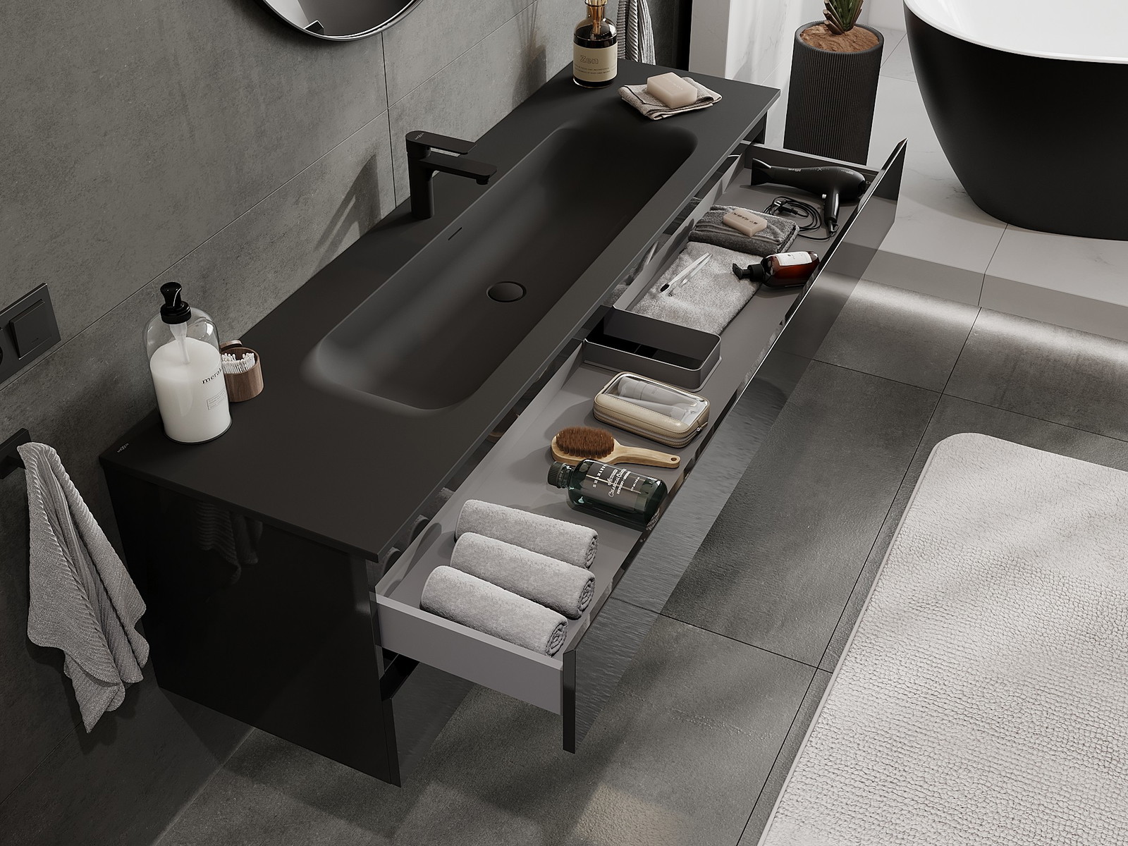 A fiókban lévő kivágás úgy van kialakítva, hogy befogadja a mosdó telepítéseknél szükséges szifont. Ennek köszönhetően a bútor teljesen funkcionálisan felszerelhető anélkül, hogy a fiók terének egy részét fel kellene áldozni a telepítés miatt.