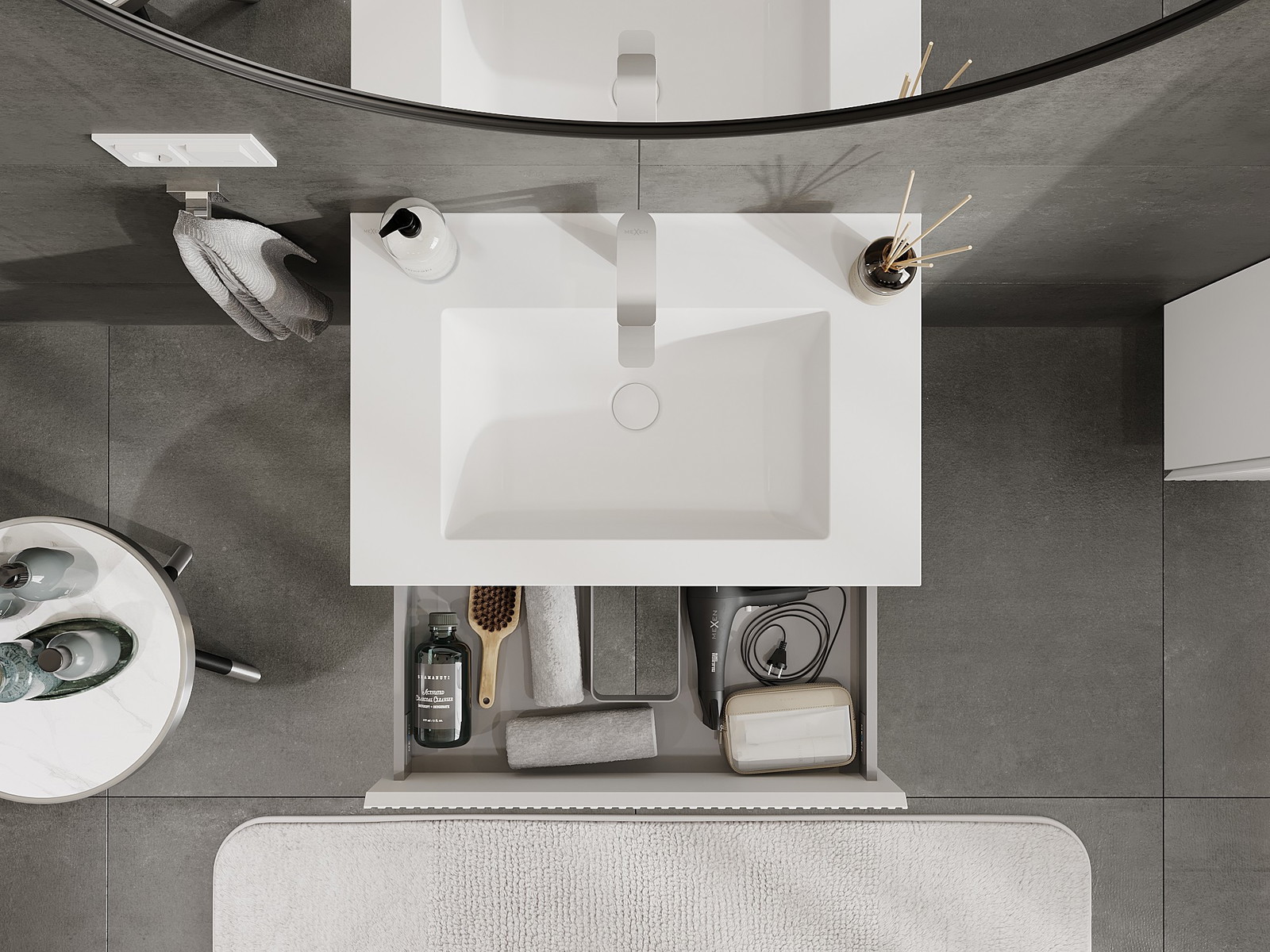 A fiókban lévő kivágás úgy van kialakítva, hogy befogadja a mosdó telepítéseknél szükséges szifont. Ennek köszönhetően a bútor teljesen funkcionálisan felszerelhető anélkül, hogy a fiók terének egy részét fel kellene áldozni a telepítés miatt.