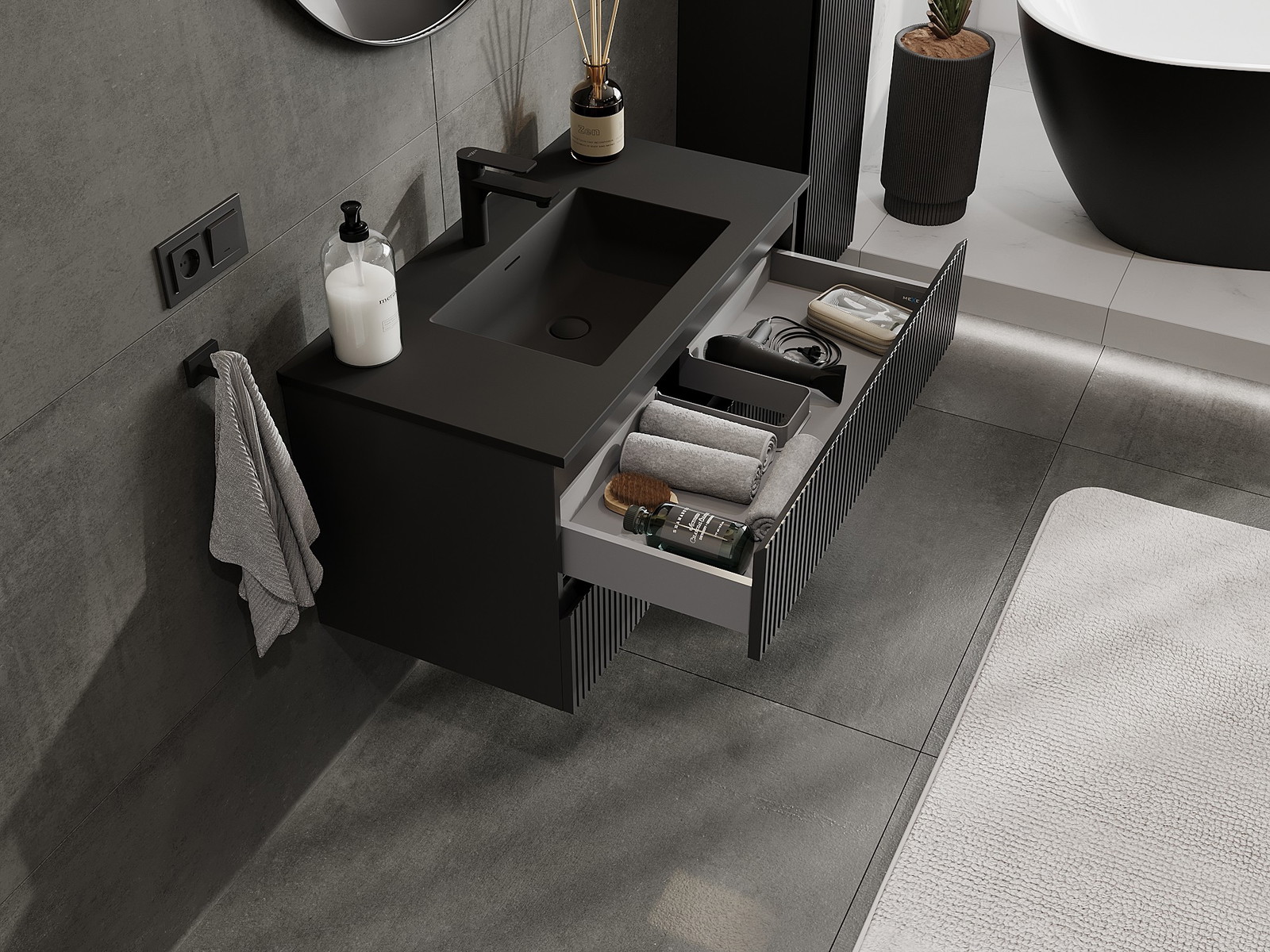 A fiókban lévő kivágás úgy van kialakítva, hogy befogadja a mosdó telepítéseknél szükséges szifont. Ennek köszönhetően a bútor teljesen funkcionálisan felszerelhető anélkül, hogy a fiók terének egy részét fel kellene áldozni a telepítés miatt.