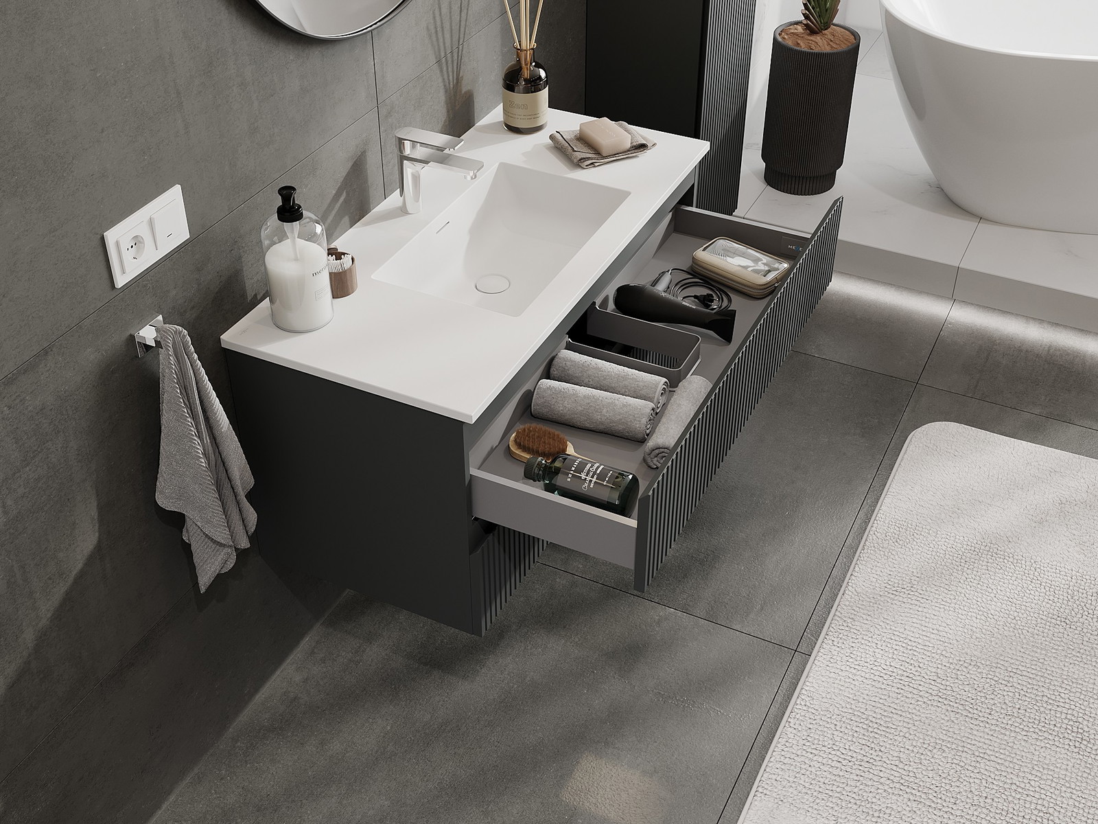 A fiókban lévő kivágás úgy van kialakítva, hogy befogadja a mosdó telepítéseknél szükséges szifont. Ennek köszönhetően a bútor teljesen funkcionálisan felszerelhető anélkül, hogy a fiók terének egy részét fel kellene áldozni a telepítés miatt.