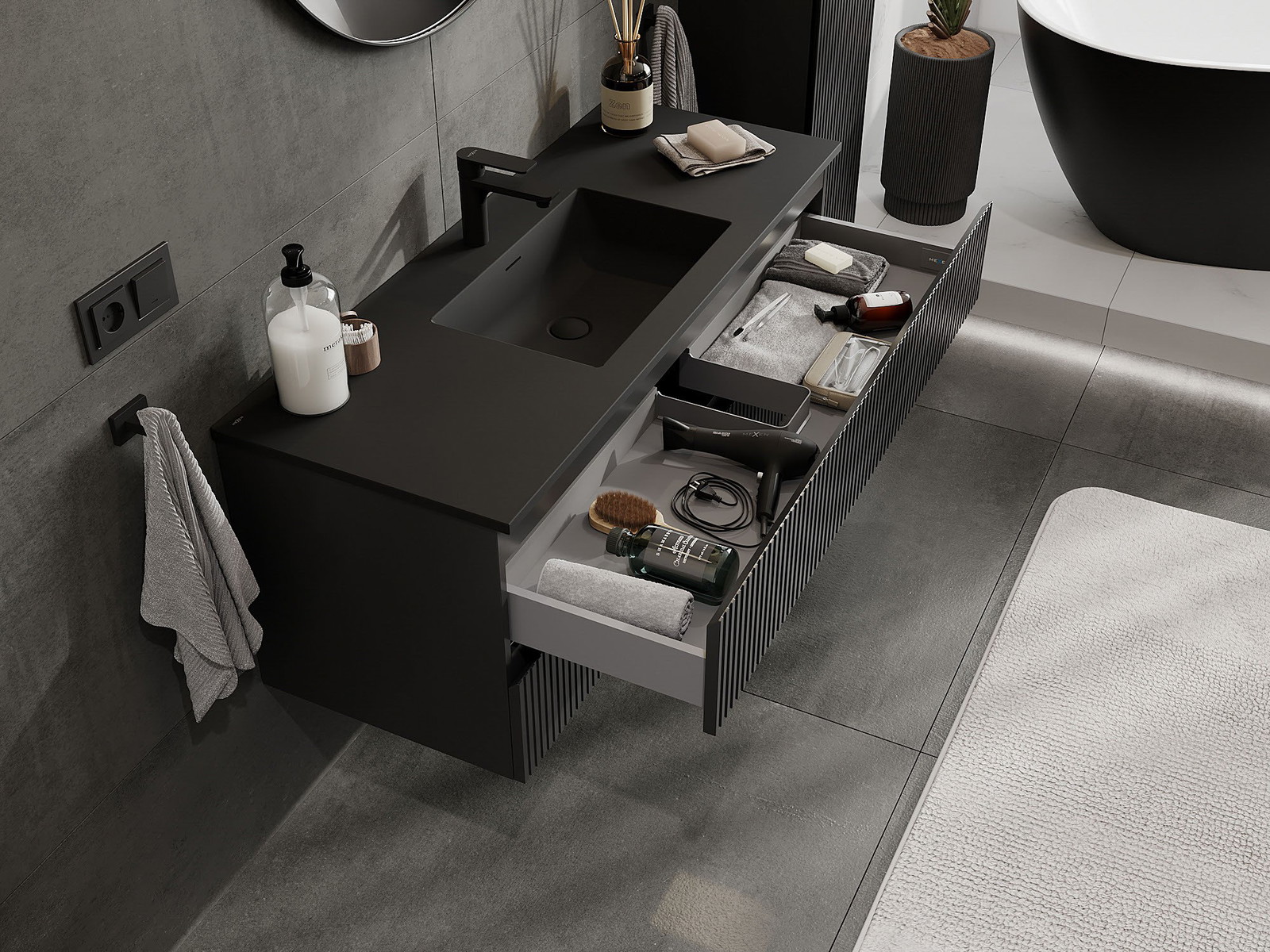 A fiókban lévő kivágás úgy van kialakítva, hogy befogadja a mosdó telepítéseknél szükséges szifont. Ennek köszönhetően a bútor teljesen funkcionálisan felszerelhető anélkül, hogy a fiók terének egy részét fel kellene áldozni a telepítés miatt.