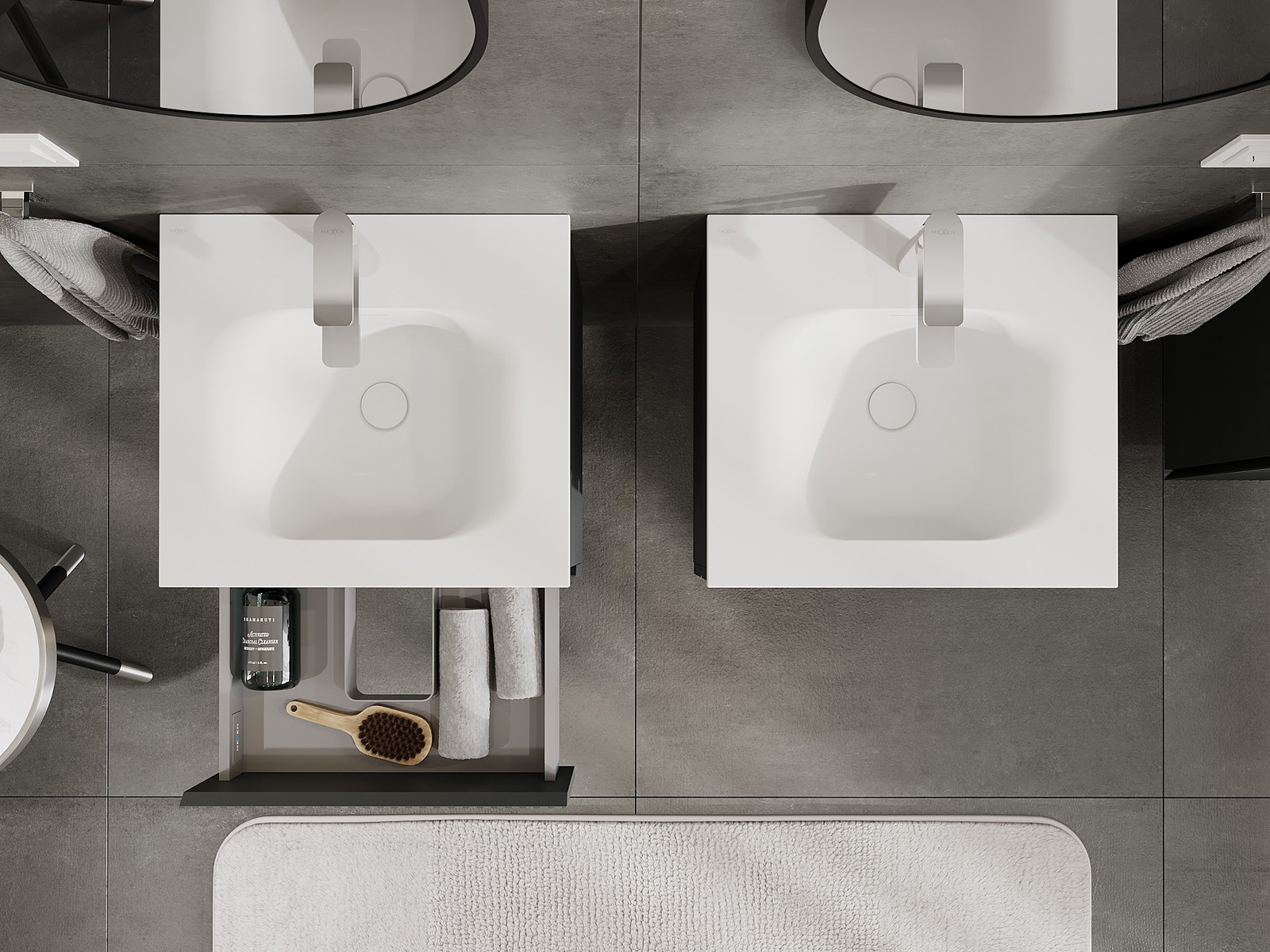 A fiókban lévő kivágás úgy van kialakítva, hogy befogadja a mosdó telepítéseknél szükséges szifont. Ennek köszönhetően a bútor teljesen funkcionálisan felszerelhető anélkül, hogy a fiók terének egy részét fel kellene áldozni a telepítés miatt.