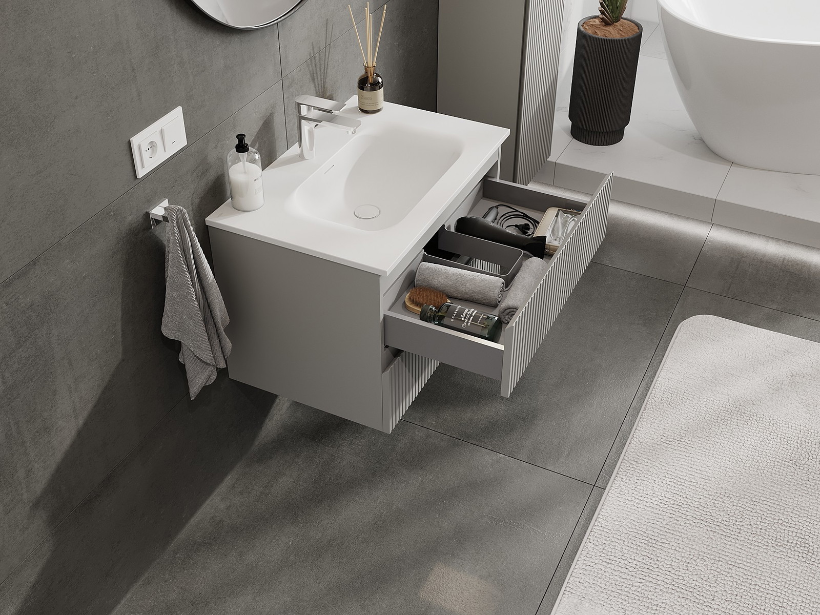A fiókban lévő kivágás úgy van kialakítva, hogy befogadja a mosdó telepítéseknél szükséges szifont. Ennek köszönhetően a bútor teljesen funkcionálisan felszerelhető anélkül, hogy a fiók terének egy részét fel kellene áldozni a telepítés miatt.