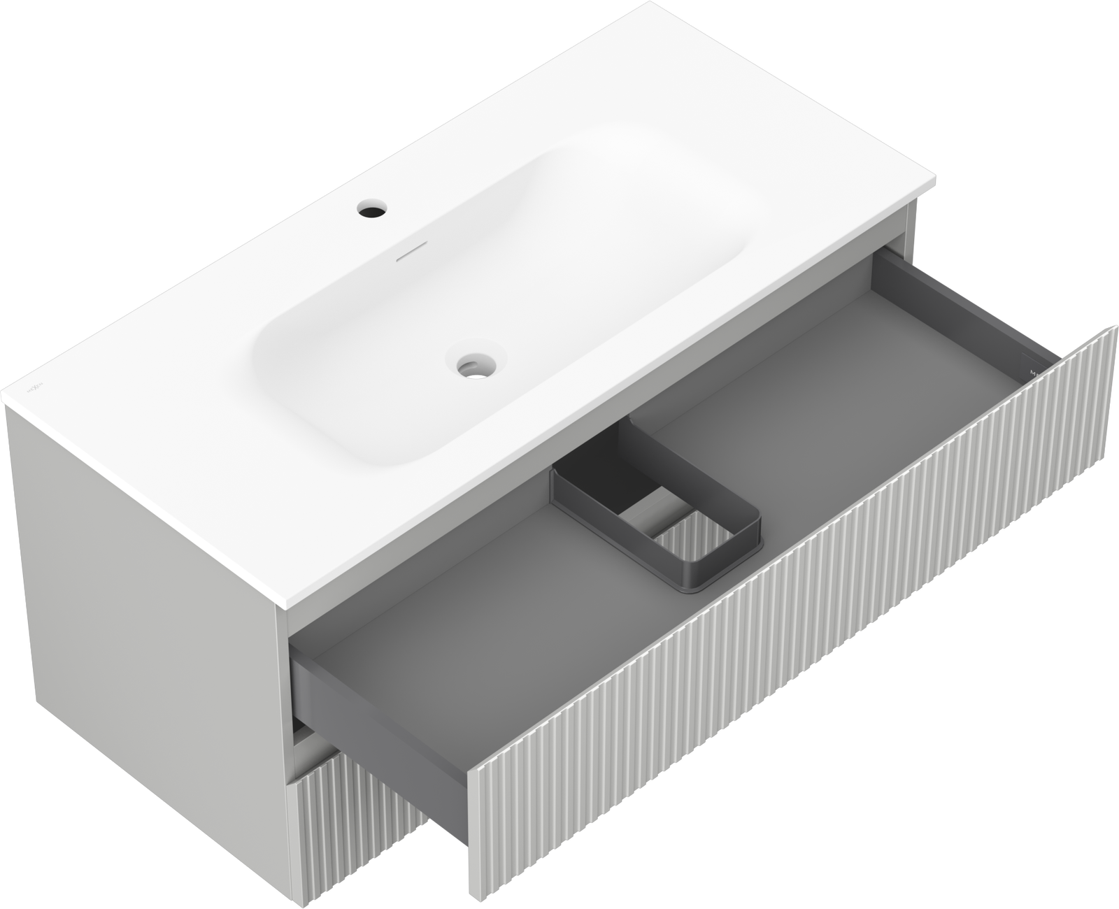 A fiókban lévő kivágás úgy van kialakítva, hogy befogadja a mosdó telepítéseknél szükséges szifont. Ennek köszönhetően a bútor teljesen funkcionálisan felszerelhető anélkül, hogy a fiók terének egy részét fel kellene áldozni a telepítés miatt.