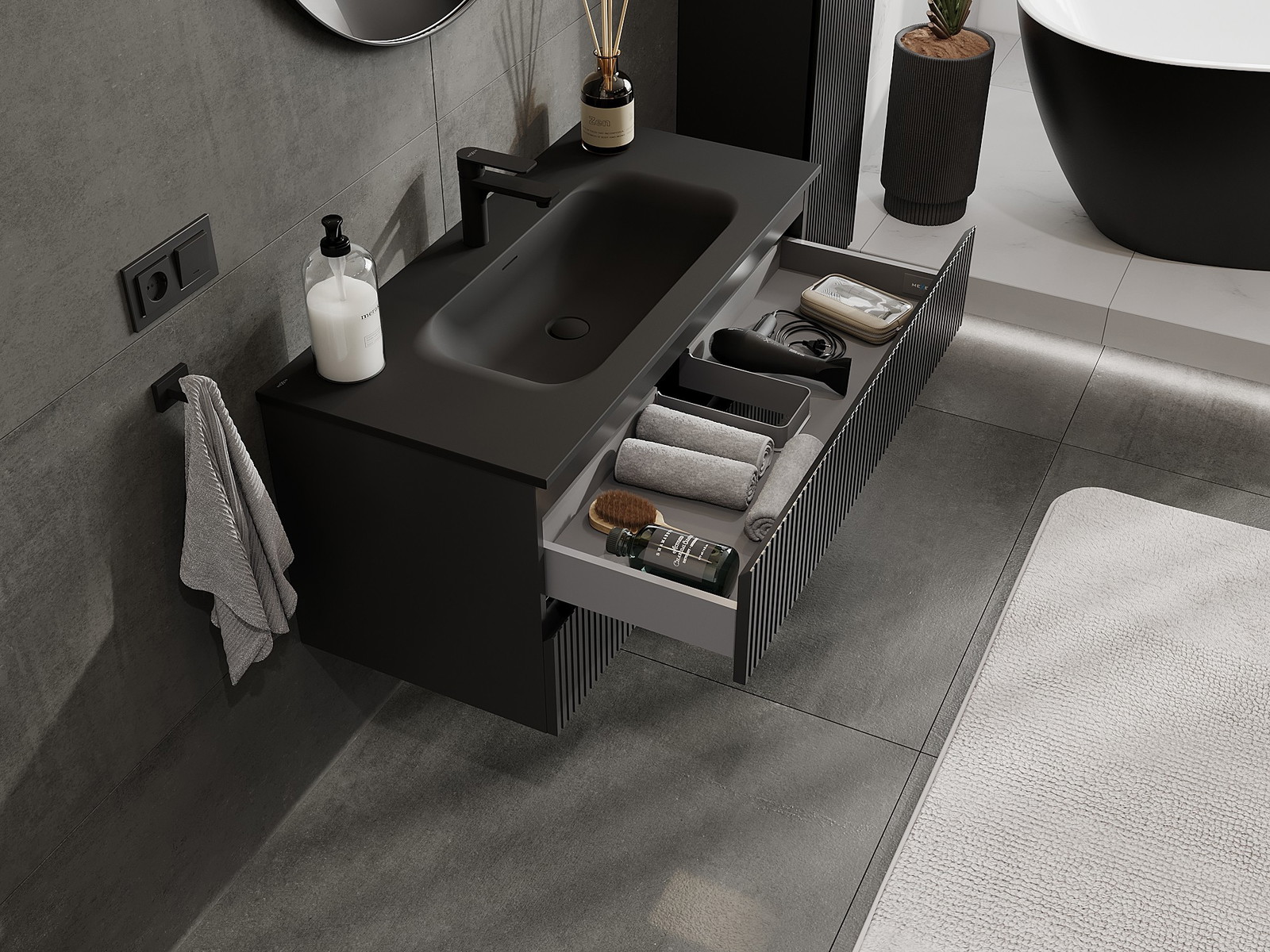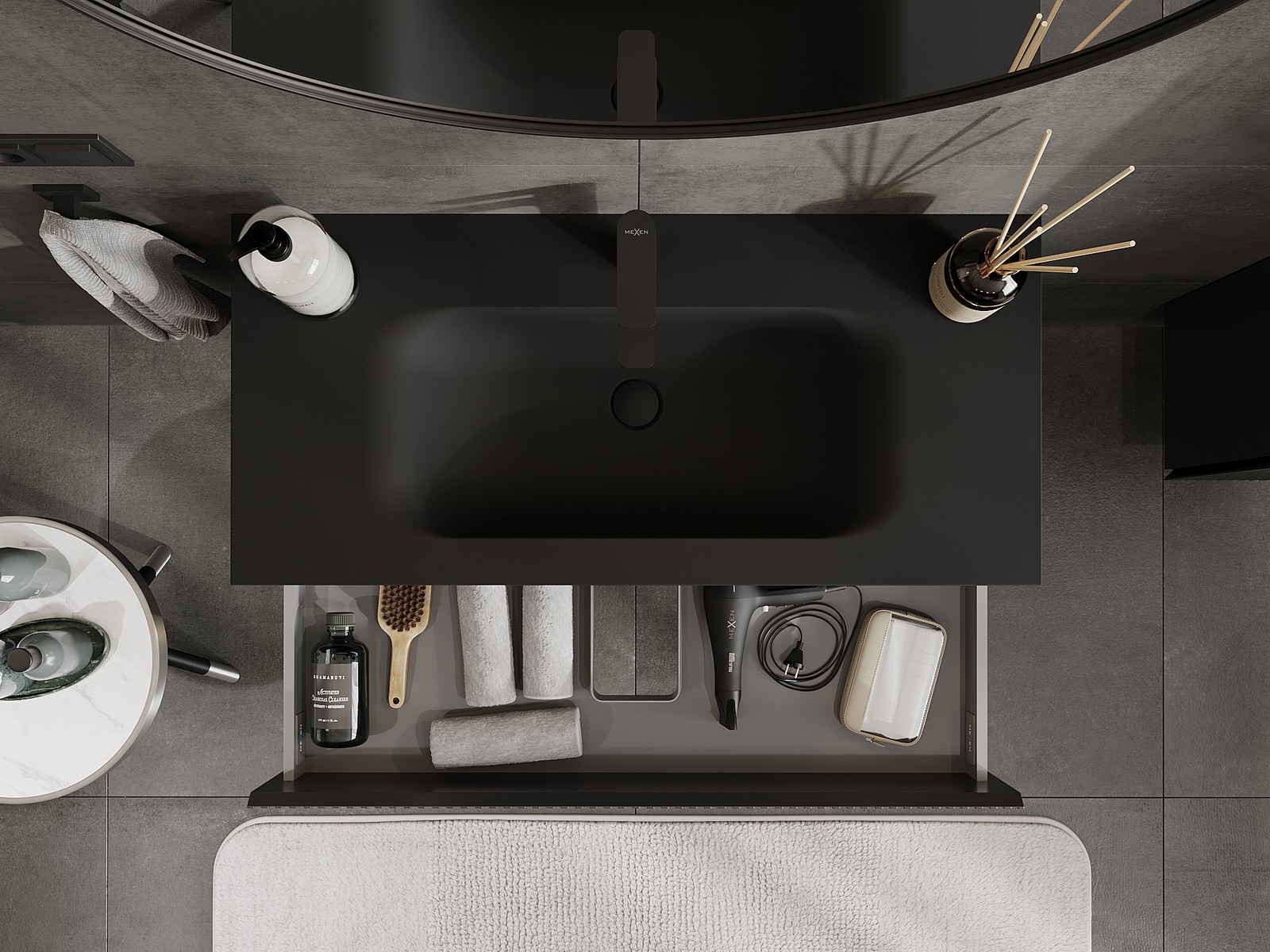 A fiókban lévő kivágás úgy van kialakítva, hogy befogadja a mosdó telepítéseknél szükséges szifont. Ennek köszönhetően a bútor teljesen funkcionálisan felszerelhető anélkül, hogy a fiók terének egy részét fel kellene áldozni a telepítés miatt.