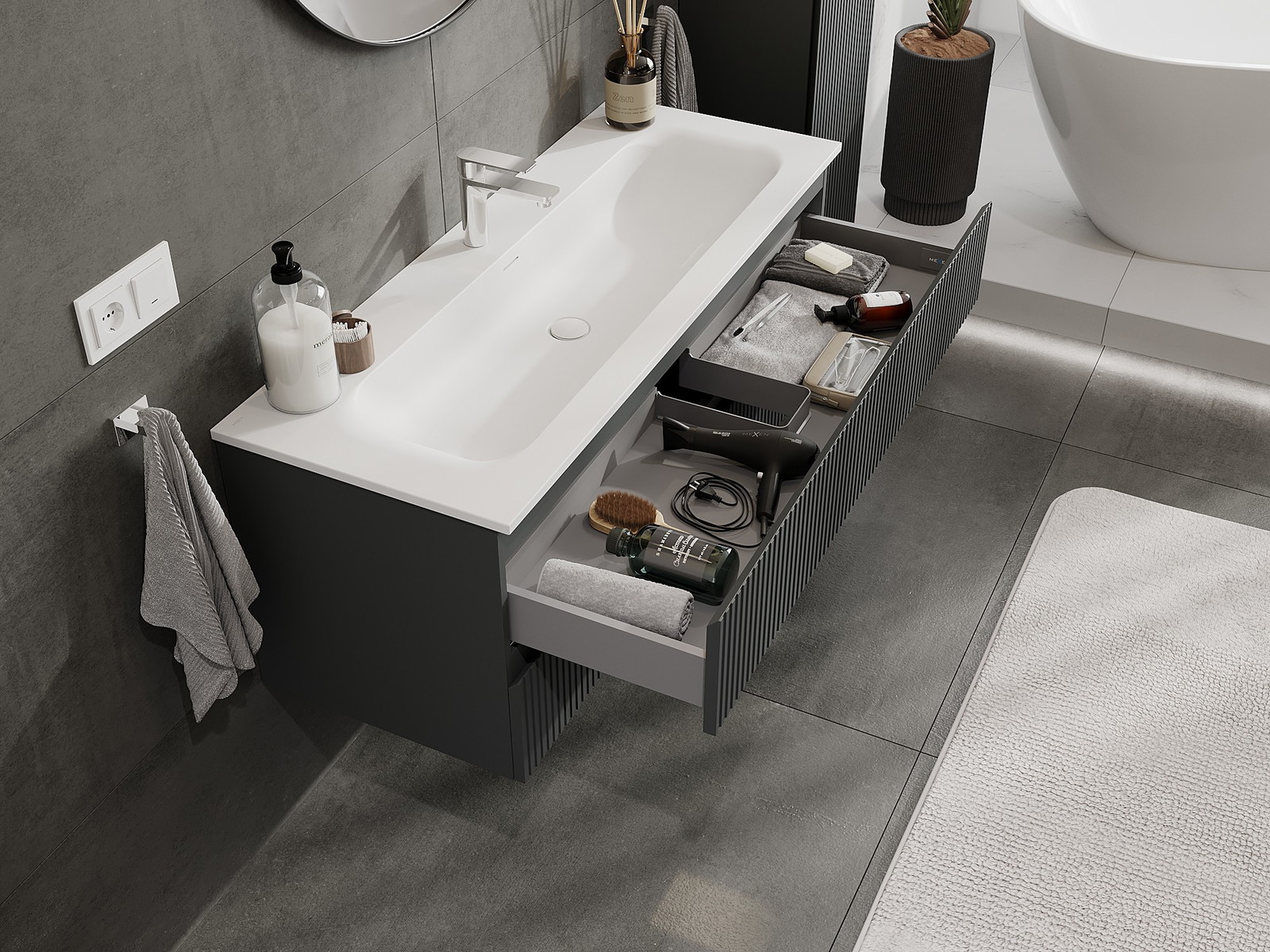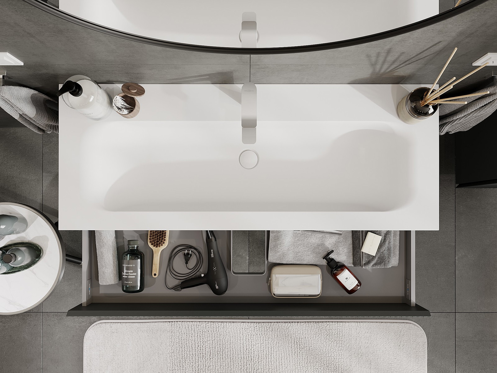 A fiókban lévő kivágás úgy van kialakítva, hogy befogadja a mosdó telepítéseknél szükséges szifont. Ennek köszönhetően a bútor teljesen funkcionálisan felszerelhető anélkül, hogy a fiók terének egy részét fel kellene áldozni a telepítés miatt.