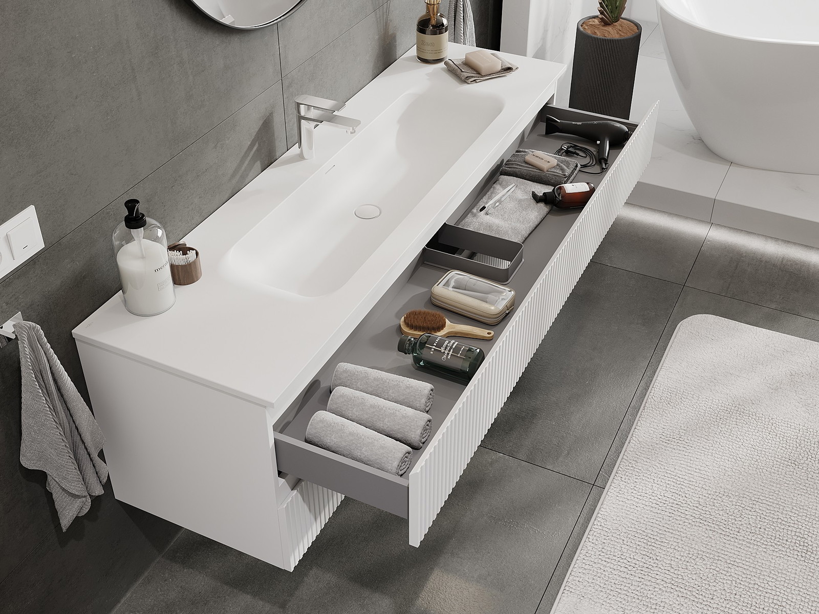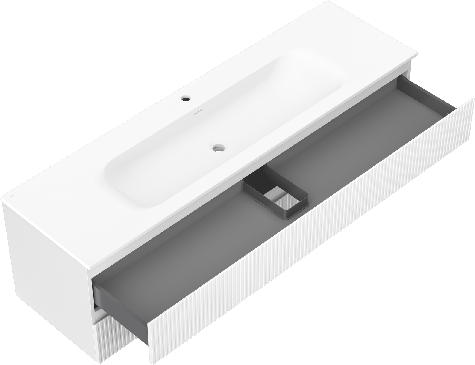 A fiókban lévő kivágás úgy van kialakítva, hogy befogadja a mosdó telepítéseknél szükséges szifont. Ennek köszönhetően a bútor teljesen funkcionálisan felszerelhető anélkül, hogy a fiók terének egy részét fel kellene áldozni a telepítés miatt.