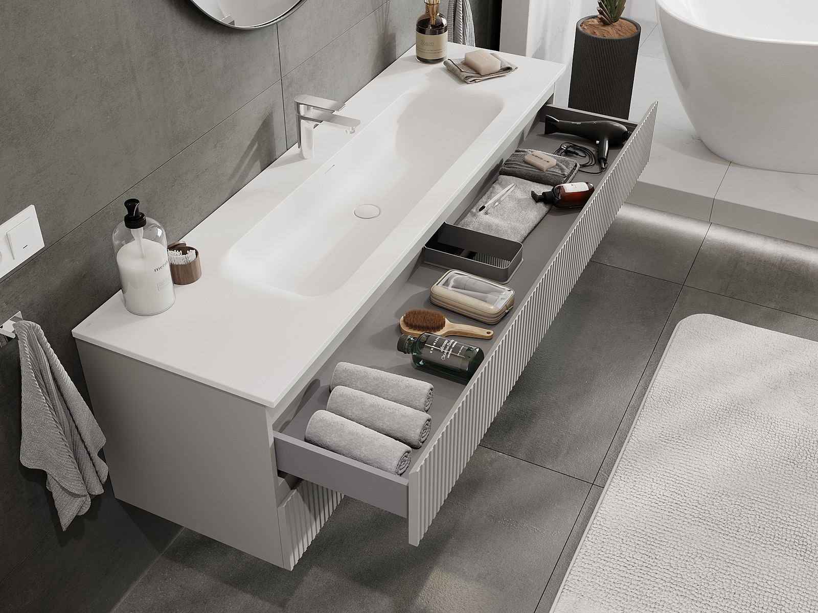 A fiókban lévő kivágás úgy van kialakítva, hogy befogadja a mosdó telepítéseknél szükséges szifont. Ennek köszönhetően a bútor teljesen funkcionálisan felszerelhető anélkül, hogy a fiók terének egy részét fel kellene áldozni a telepítés miatt.