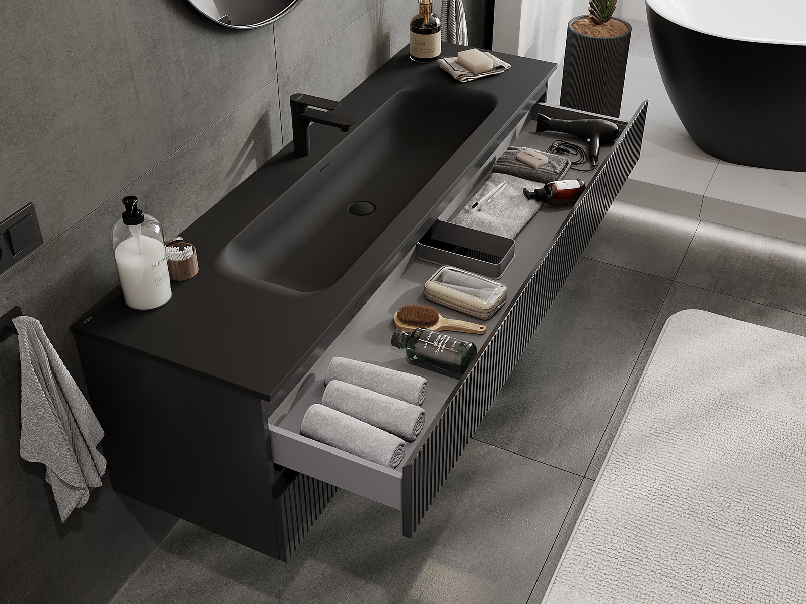 A fiókban lévő kivágás úgy van kialakítva, hogy befogadja a mosdó telepítéseknél szükséges szifont. Ennek köszönhetően a bútor teljesen funkcionálisan felszerelhető anélkül, hogy a fiók terének egy részét fel kellene áldozni a telepítés miatt.