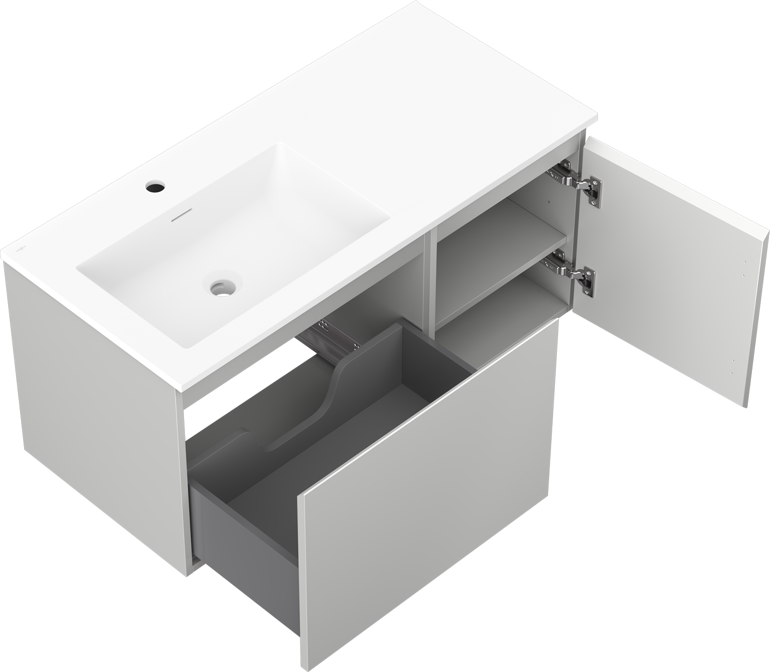A fiókban lévő kivágás úgy van kialakítva, hogy befogadja a mosdó telepítéseknél szükséges szifont. Ennek köszönhetően a bútor teljesen funkcionálisan felszerelhető anélkül, hogy a fiók terének egy részét fel kellene áldozni a telepítés miatt.