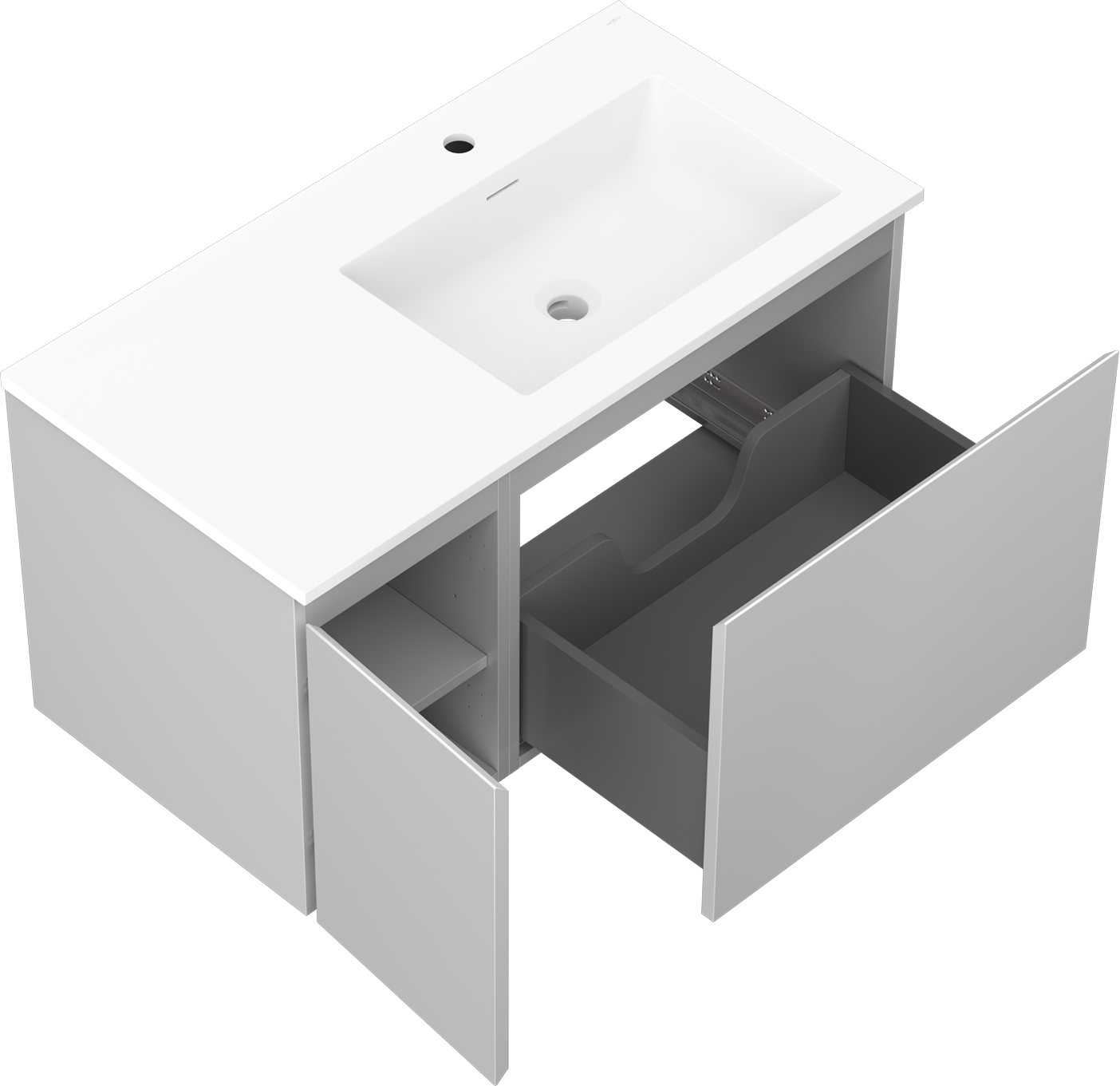 A fiókban lévő kivágás úgy van kialakítva, hogy befogadja a mosdó telepítéseknél szükséges szifont. Ennek köszönhetően a bútor teljesen funkcionálisan felszerelhető anélkül, hogy a fiók terének egy részét fel kellene áldozni a telepítés miatt.