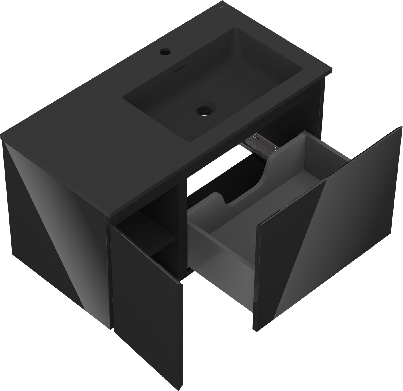 Mexen Orio 90 cm-es Otis fürdőszobaszekrény jobb oldali mosdóval, 1 fiók, 1 ajtó, fekete fényes/fekete matt